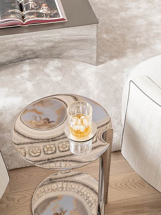 由此进入客厅,天花板上饰有壁画,一面矮墙将客厅一分为二,从而不会切断天花板的视觉效果,值得一提的是,矮墙选用Petra Antiqua石材覆面。一边是交谈区,配备Nendo设计的Torii沙发和扶手椅,其结构细节展现出日本传统风格,两侧摆放着Nay边几、Kirk Bench软垫长凳、呈现雕塑效果的Benson边几,其特点是将造型与珍贵材料以别出心裁的方式结合在一起,这些都是Rodolfo Dordoni的设计作品。另一边是休闲区,其中的家具主角是Hamilton沙发座椅系列,这也是Minotti旗下永恒格调的代表作品,由Rodolfo Dordoni设计。