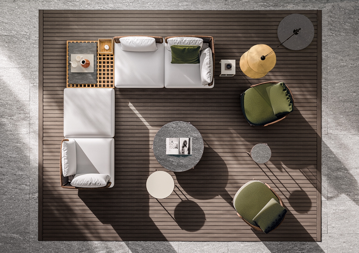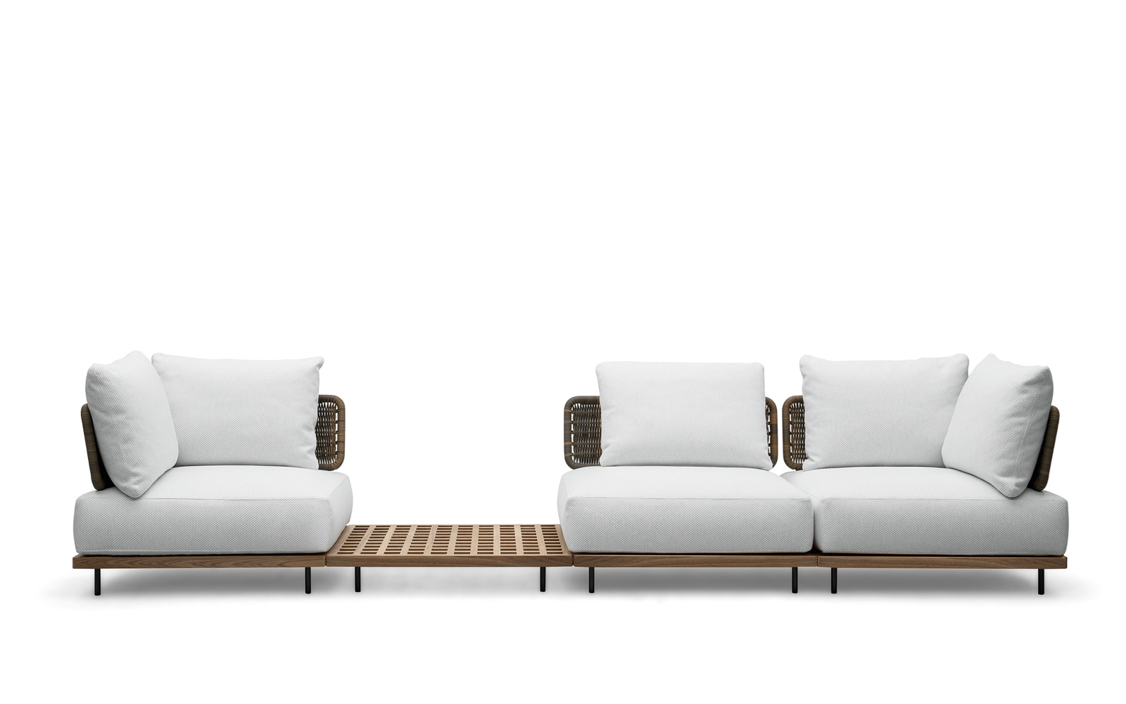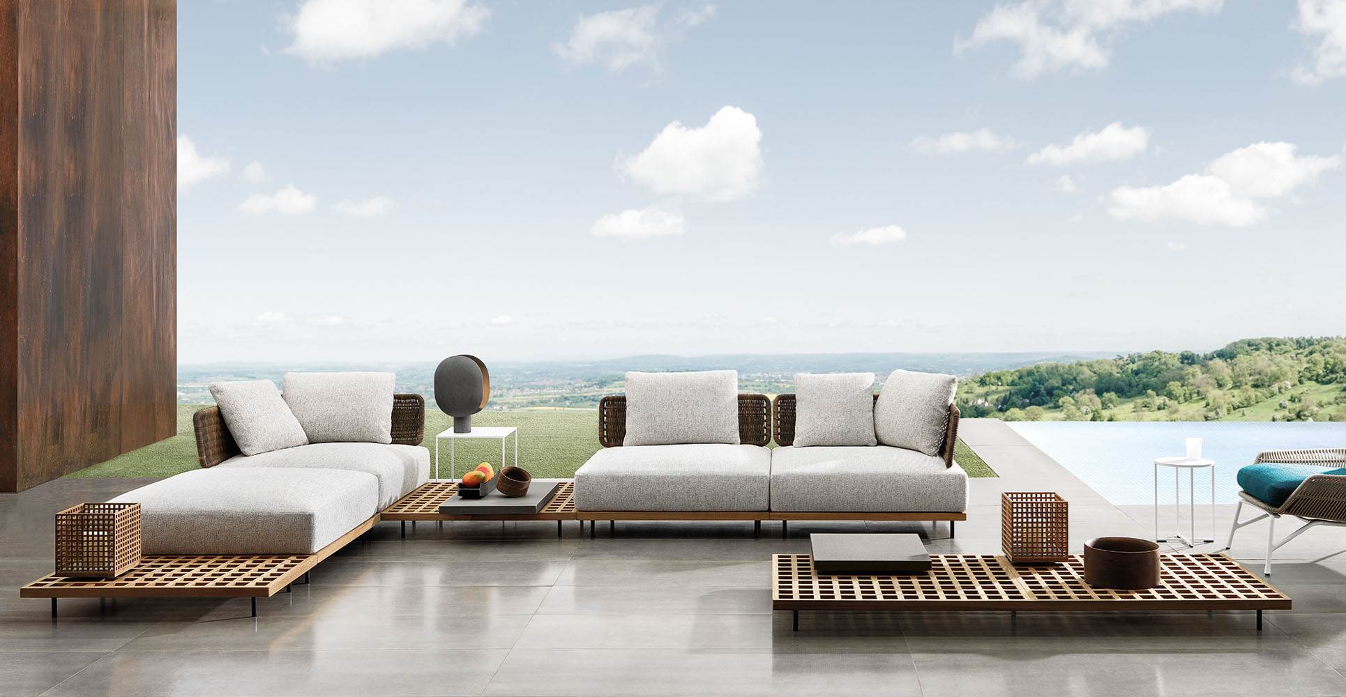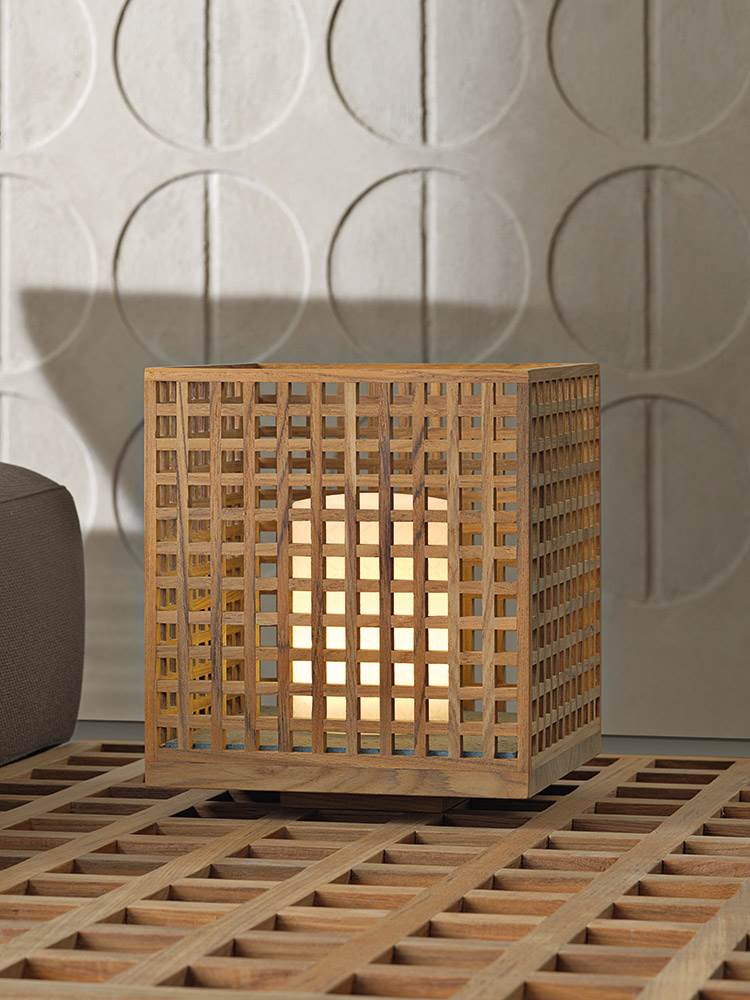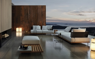巴西建筑师Marcio Kogan在悬浮的方形平台上设立精细的模块化系统,借鉴了格栅的设计,这种格栅常用在船上,以便于排水,他设计出一系列兼具轻盈感和灵活性的户外家具产品。