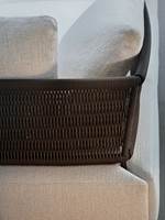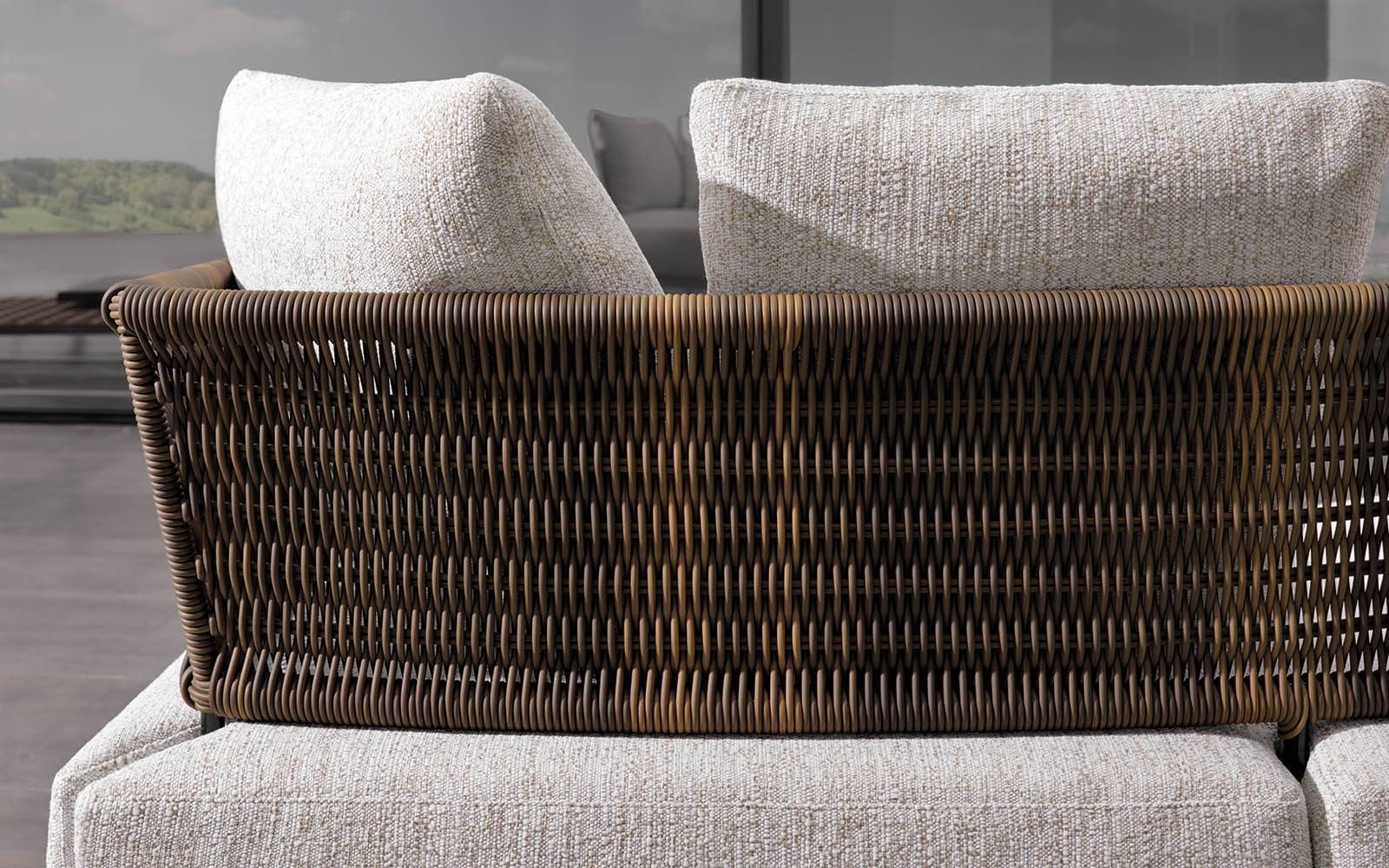 Metal backrest and armrests subjected to three processing phases: sand blasting, zinc primer for outdoor use (facilitates and improves adhesion of the finish paint) with polyester powder coat for outdoor use in polished Pewter color finish. The metal structure is covered in a wickereffect braided 5 mm Ø fibre; available in the following colors: Mud and Licorice