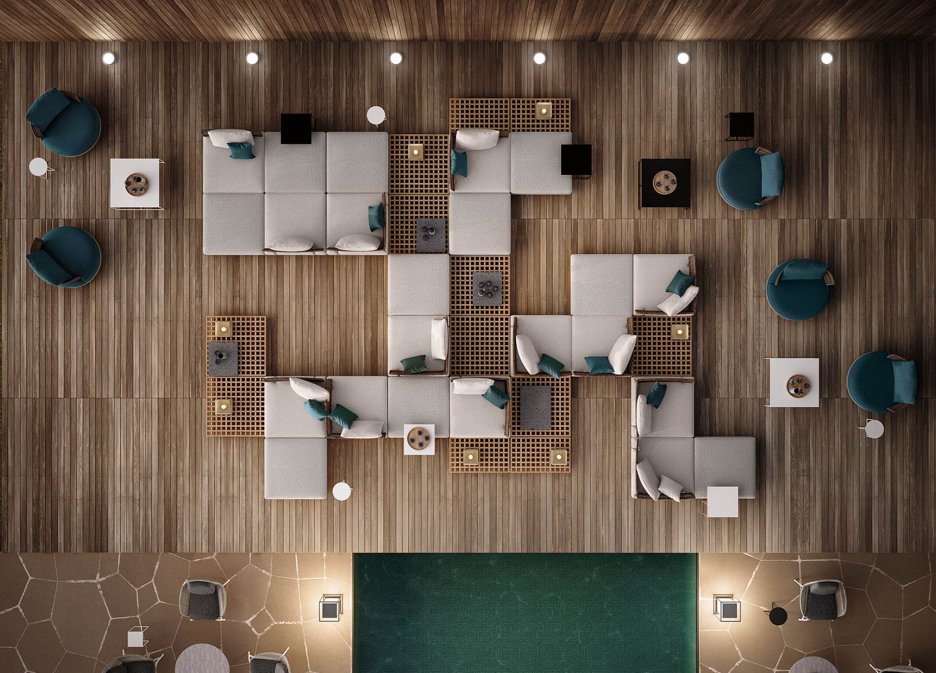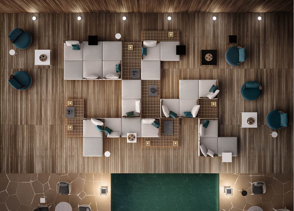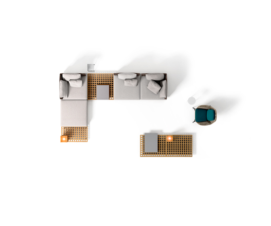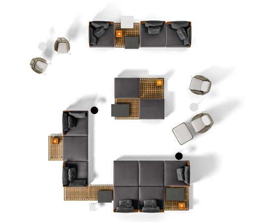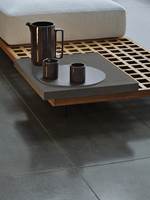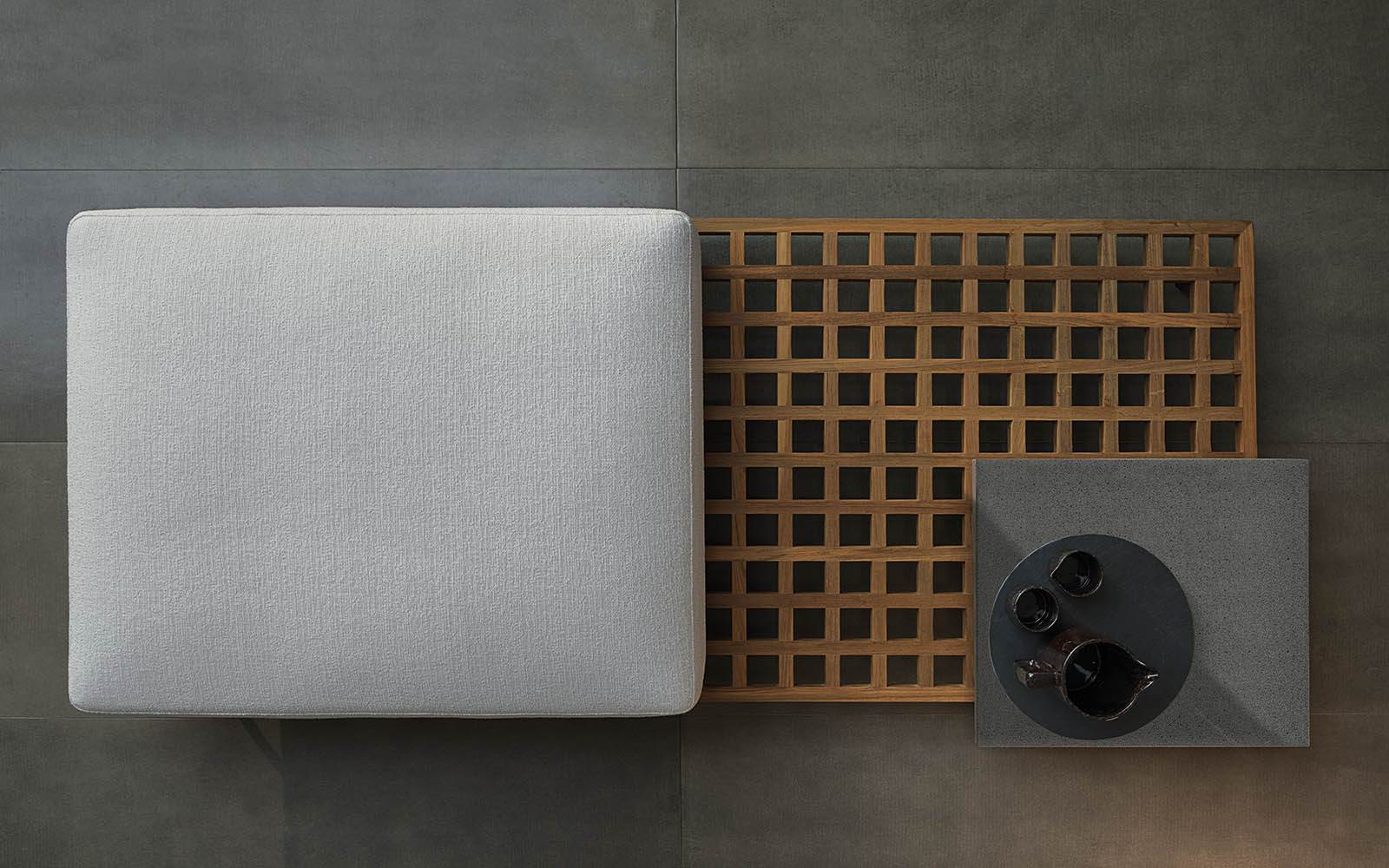 Quadrado采用悬浮式方形平台,借鉴了格栅的设计,这种格栅常用在船上,以便于排水。这些模块可以单独应用,也可以打造出独特的组合,并在其中插入托盘和烛台等其他配件,搭配圆形的扶手椅、方形或圆形的休闲凳。