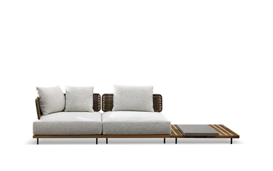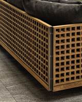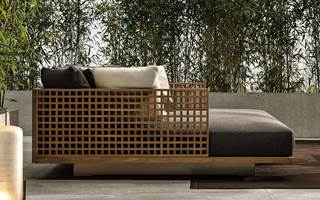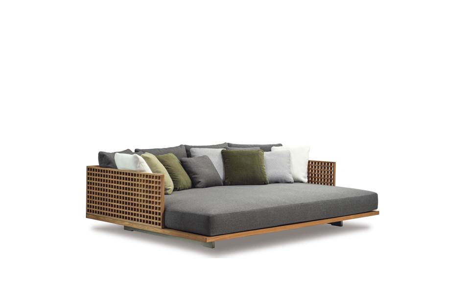 Quadrado双人沙发床版本推出242x180厘米的宽大尺寸,打造出让人可以尽情放松的一隅舒适天地。柚木格栅的扶手和靠背呈ㄇ字造型,搭配宽大的床垫和柔软蓬松的靠垫。两个铜色金属横梁为双人沙发床提供支撑。