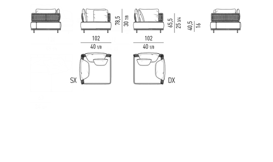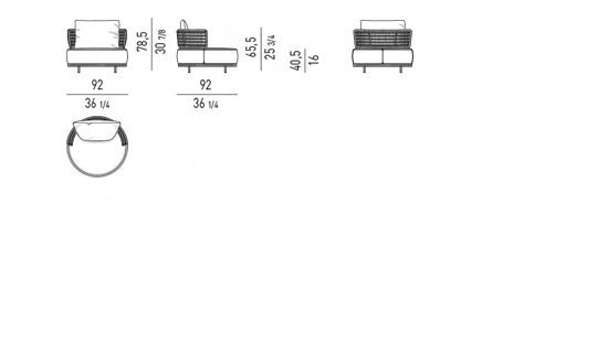 Seat and backrest cushions in high resilience polyurethane foam and eco-friendly, waterproof fibre. To provide greater protection from water and moisture for the padding, all the cushions are covered in water-repellent polyester fabric. All the accessories – hinges, yarn – are waterproof and therefore suitable for outdoor use.