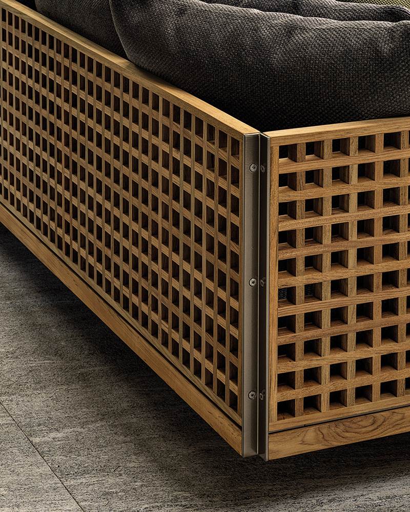 In solid teak (Tectona Grandis - First European Quality), 40 mm thick, natural finish, kiln-dried. Worked on CNC machines, assembled at 45° with finger joints reinforced with dowel pins. Underframe in metal painted for outdoor use. Woven elastic webbing for outdoor use in UVresistant synthetic rubber and polypropylene