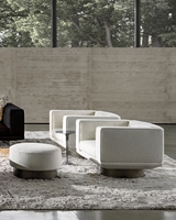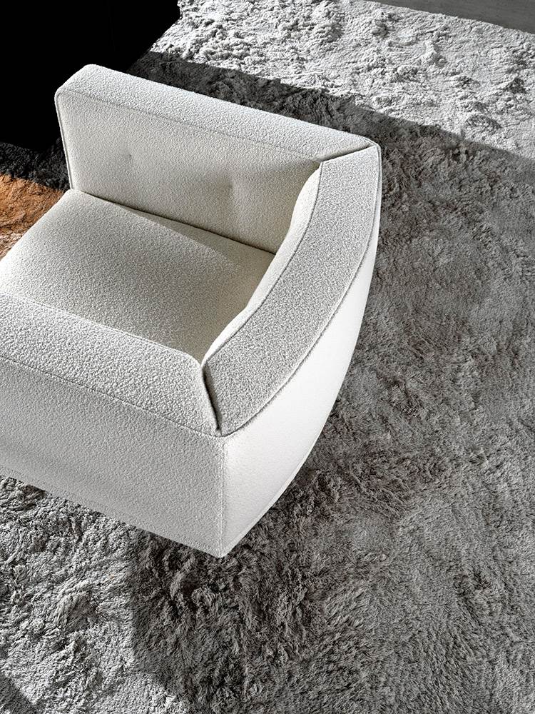 Seat in plywood. The seat structure is padded with high-resilience, variable-density polyurethane foam – except for the ottoman – with high-rubbercontent elastic webbing to maximize seating comfort. Backrest and armrest structures are made of plywood covered in high-resilience, variable-density polyurethane foam, then encased in breathable quilted heat-bonded polyester fibre laminated to hypoallergenic white cotton fabric. All of the elements employed in the quilt are hypoallergenic and made with recycled materials. Tailoring of the backrest and armrest upholstery features top-stitching.