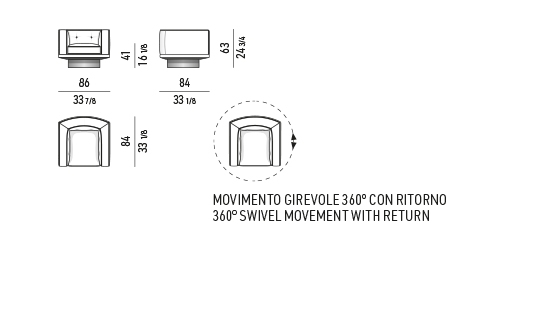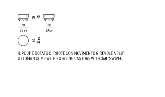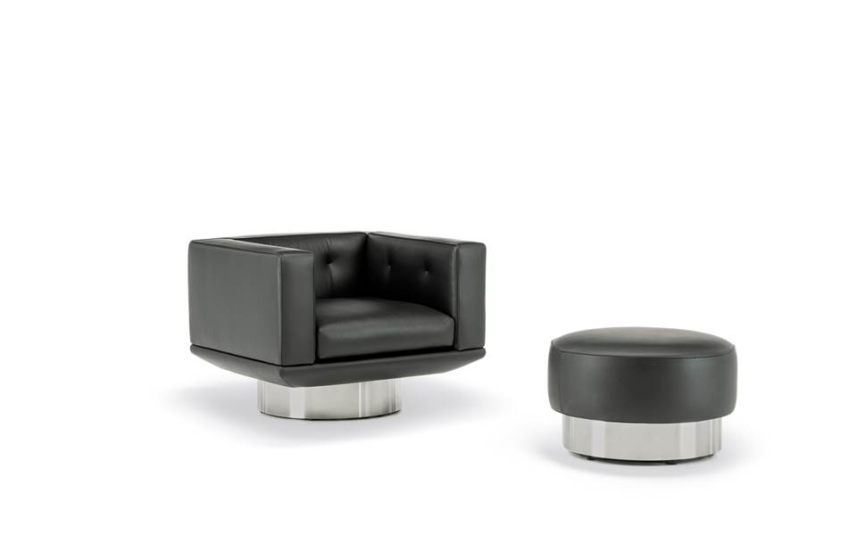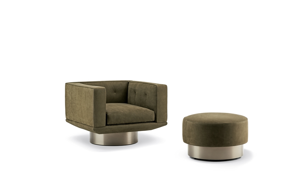 Round, available in metal with varnished polished anti-fingerprint Bronze colour finish or Chrome finish. Base has a 360° swivel movement with return and adjustable feet. Ottoman is available in stationary model with adjustable feet or on 5 castors with 360° swivel; structure in nylon and thermoplastic polyurethane rubber.