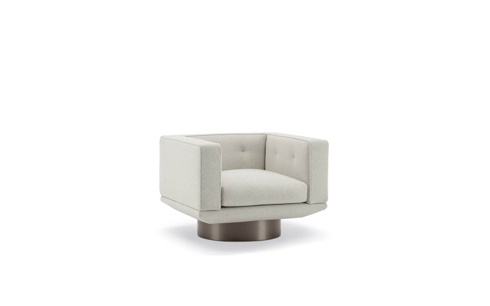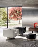 旋转式版本的基座采用金属圆柱结构,可选择铜色或亮光铬色的饰面。滚轮版椅凳也采用金属圆柱结构,并提供相同的饰面,便于移动的特性使其可以在客厅中发挥一物多用的功能。