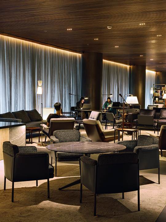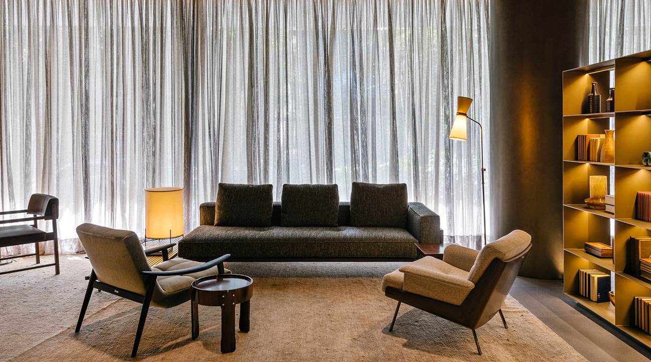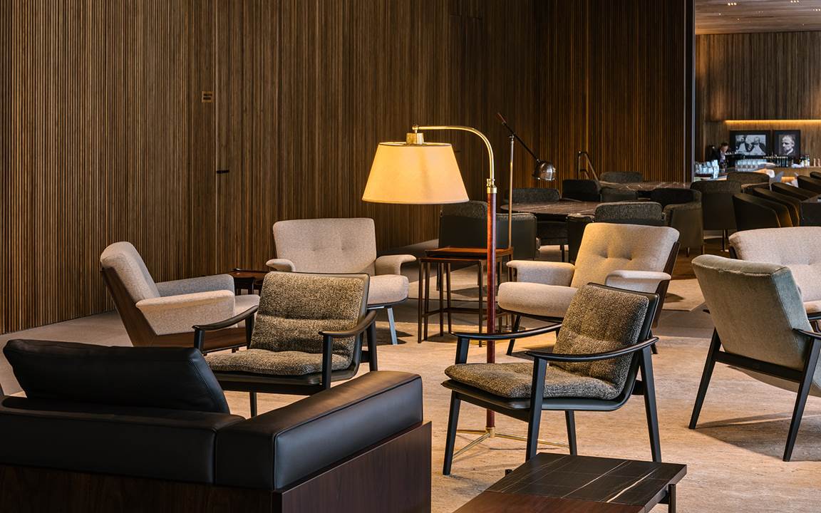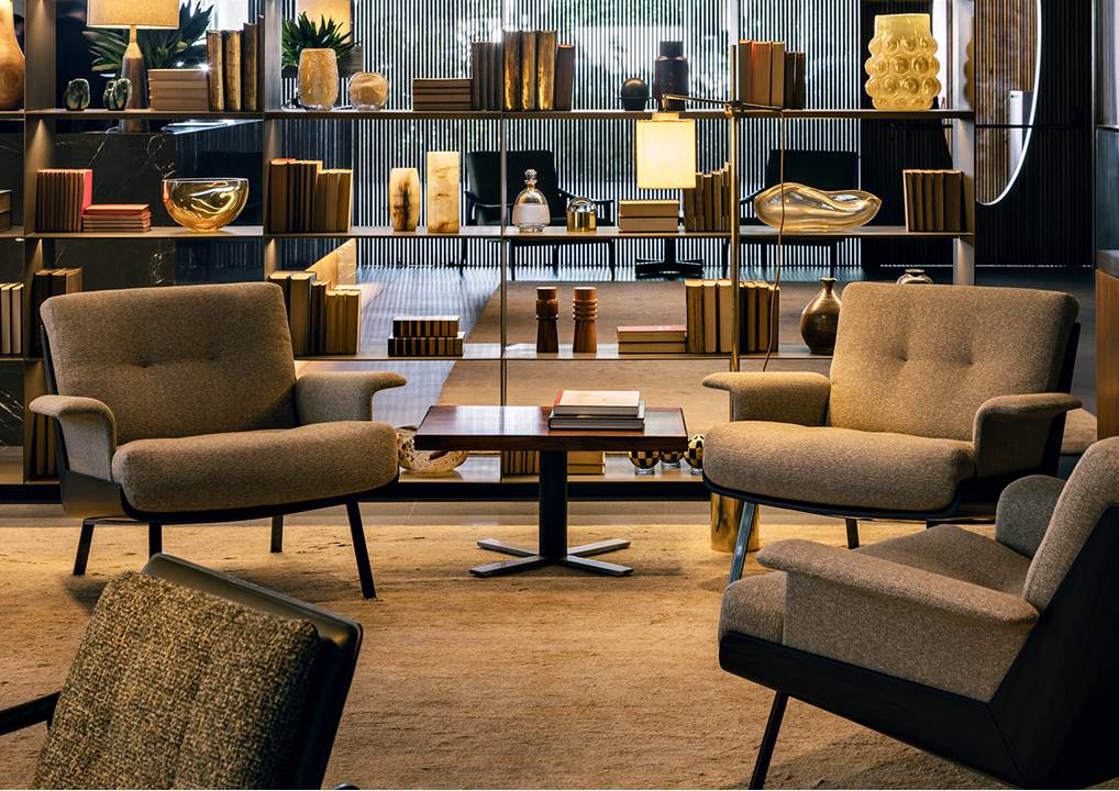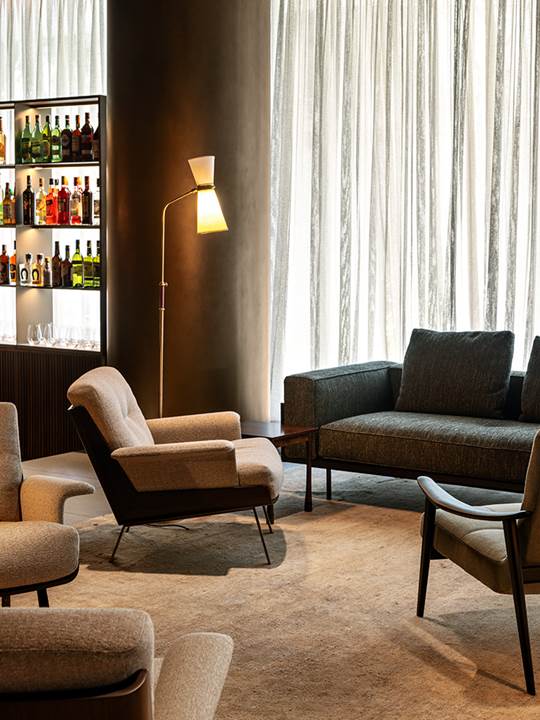 Marcio Kogan / Studio MK27设计的Brasilia沙发座椅系列采用黑色皮革和淡雅的灰色调织物覆面,与标志性的Daiki扶手椅相得益彰,这款扶手椅也是巴西建筑师Marcio Kogan的设计作品,选用深棕色Santos花梨木打造出别具一格的弧形外壳。大堂还摆放着GamFratesi设计的Fynn扶手椅,其特点在于轻盈的美感和优雅的木制结构,搭配Marcio Kogan / Studio MK27设计的Superquadra边几,大理石和Santos花梨木组合在一起的台面令人眼前一亮。吧台也有Minotti的身影,此处选用Rodolfo Dordoni设计的Reeves高脚椅、GamFratesi设计的Shelley休闲扶手椅,座椅的别致之处在于皮革材质的立方体造型和温馨舒适的椅面设计。