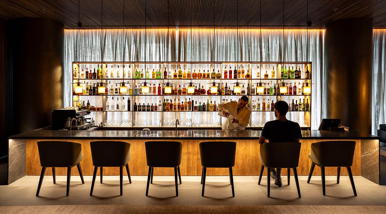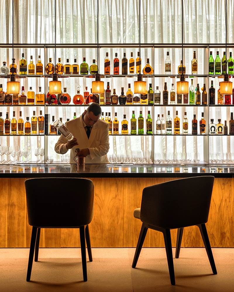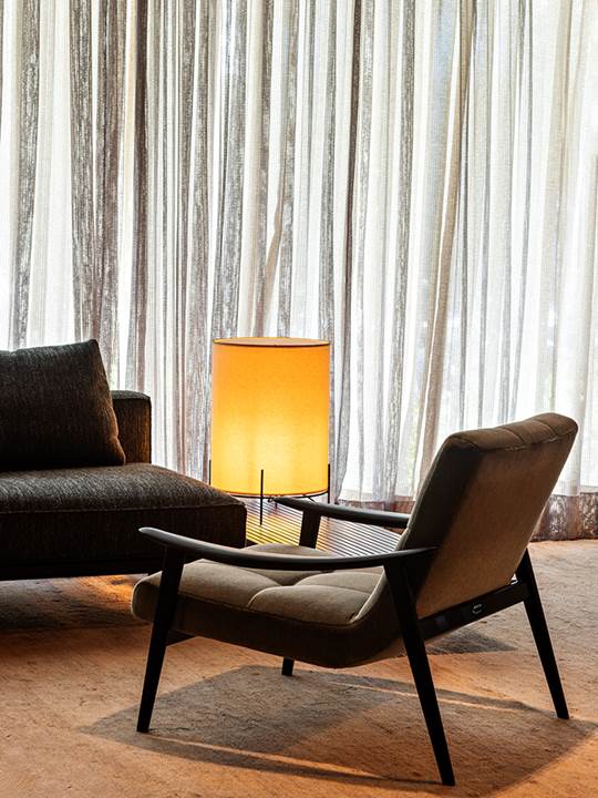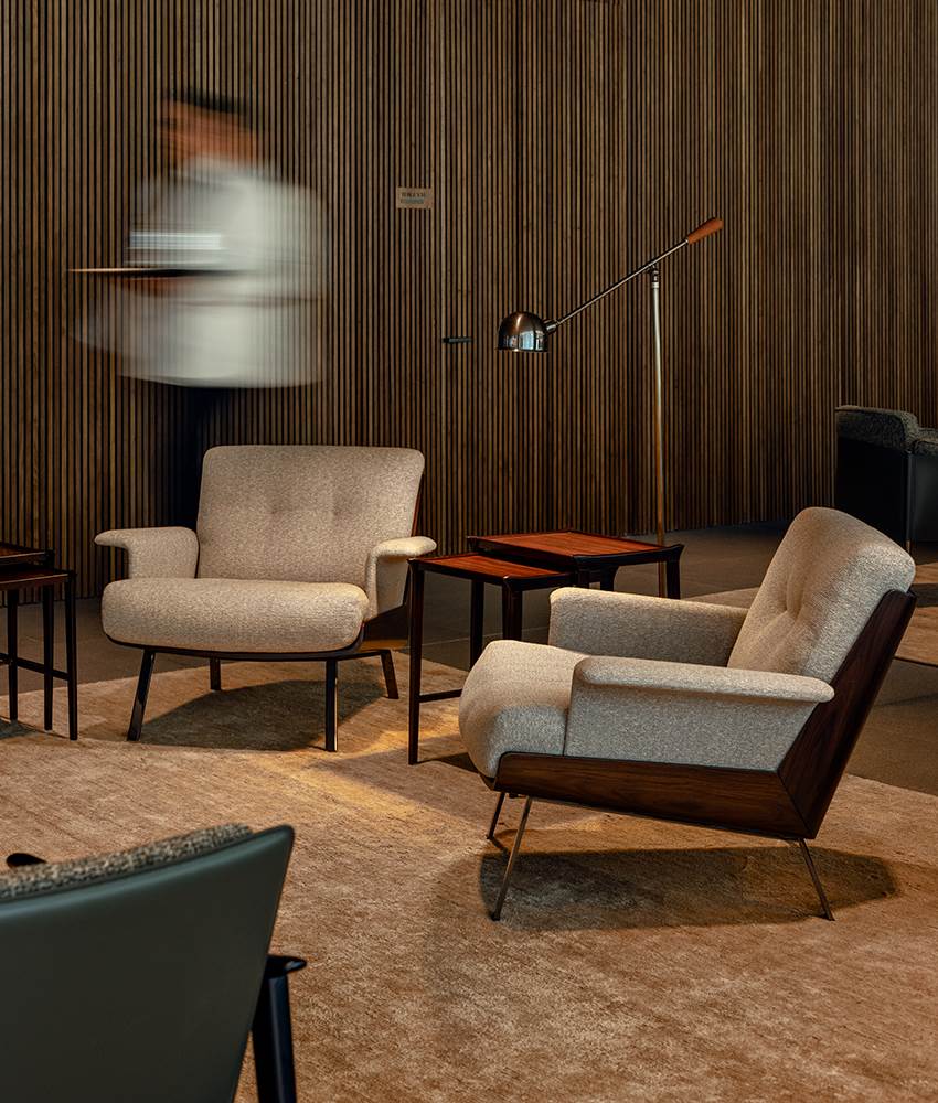 Marcio Kogan / Studio MK27设计的Brasilia沙发座椅系列采用黑色皮革和淡雅的灰色调织物覆面,与标志性的Daiki扶手椅相得益彰,这款扶手椅也是巴西建筑师Marcio Kogan的设计作品,选用深棕色Santos花梨木打造出别具一格的弧形外壳。大堂还摆放着GamFratesi设计的Fynn扶手椅,其特点在于轻盈的美感和优雅的木制结构,搭配Marcio Kogan / Studio MK27设计的Superquadra边几,大理石和Santos花梨木组合在一起的台面令人眼前一亮。吧台也有Minotti的身影,此处选用Rodolfo Dordoni设计的Reeves高脚椅、GamFratesi设计的Shelley休闲扶手椅,座椅的别致之处在于皮革材质的立方体造型和温馨舒适的椅面设计。
