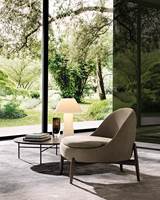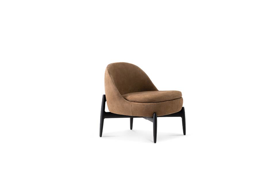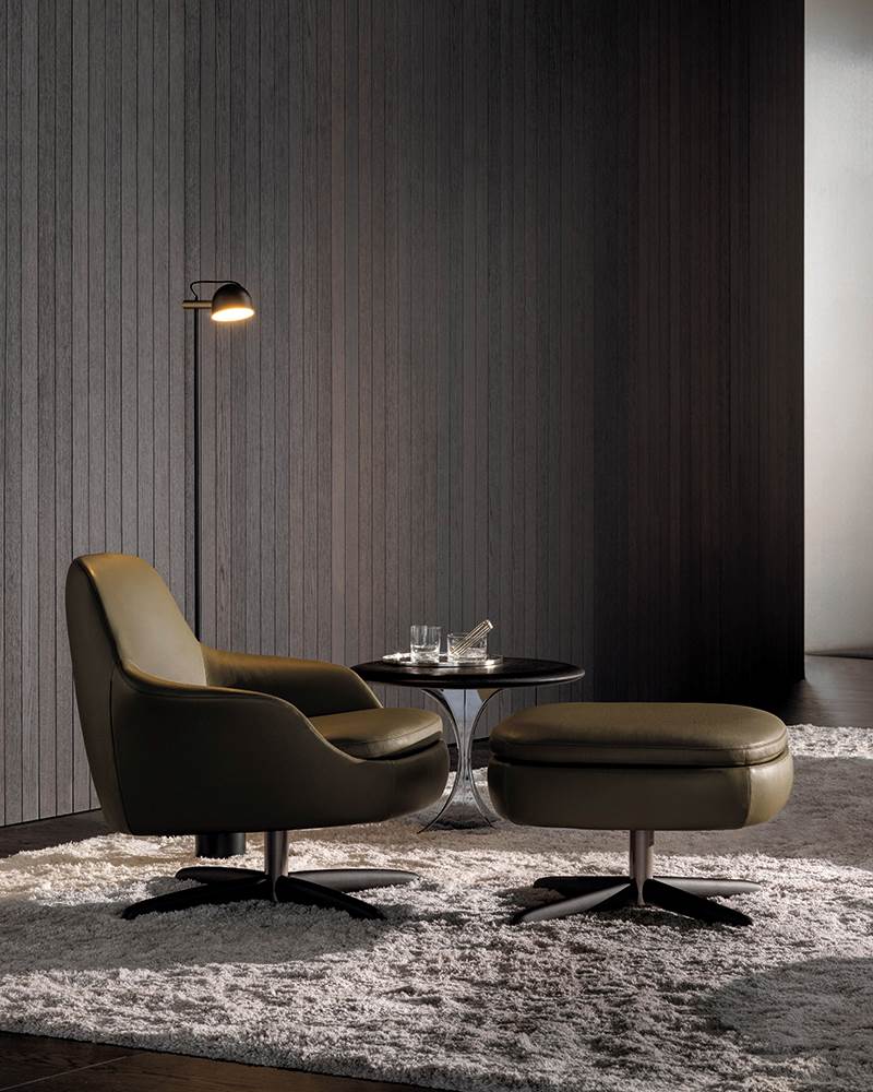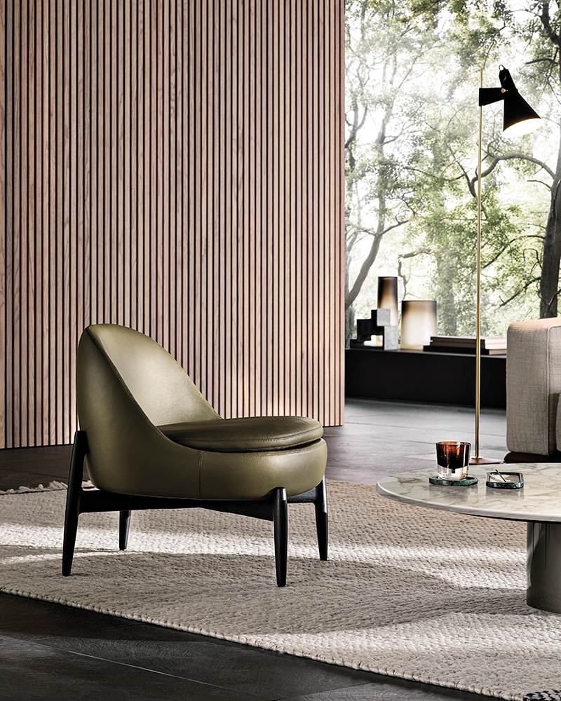 支撑腿经过抛光,优雅纤长,可以选用浅棕色的卡纳莱托核桃木实木或灰褐色漆面白蜡木实木,上方配以环抱式软垫外壳,运用垂直线条创造出轻盈的节奏。