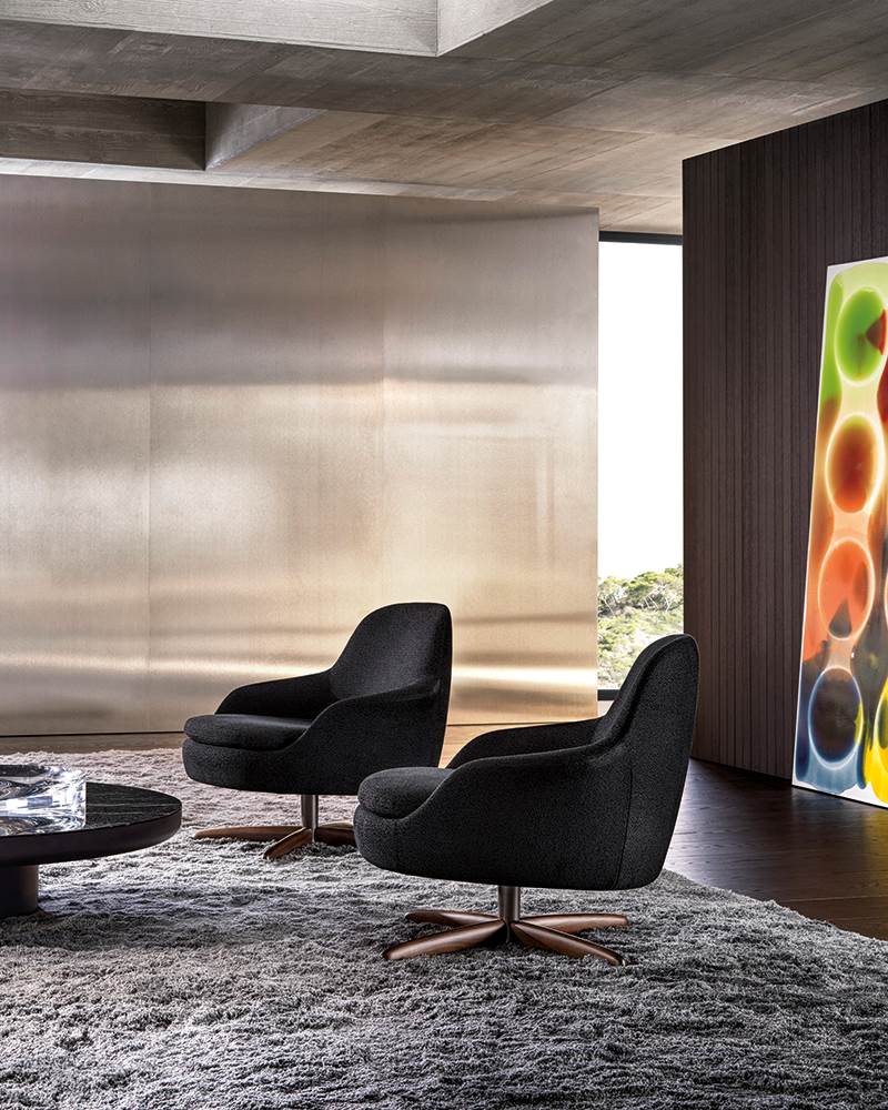 扶手椅、餐椅、休闲扶手椅均提供360°旋转的版本,并带有回位功能(基座为铜色亮光漆金属材质,支撑辐条可以选择灰褐色漆面的开孔白蜡木实木或浅棕色的卡纳莱托核桃木实木),Sendai座椅为家居空间和酒店环境增添一份舒适感。