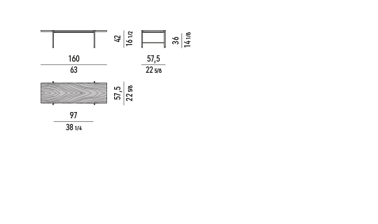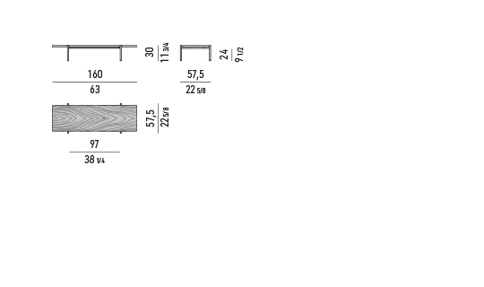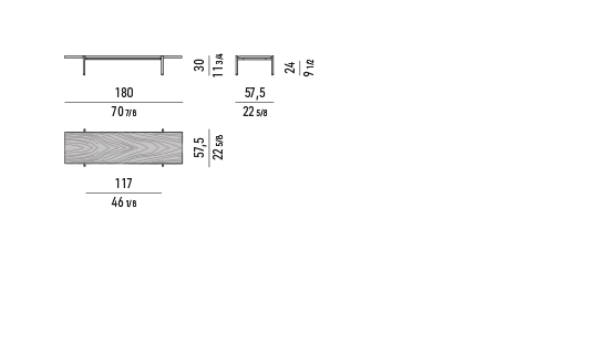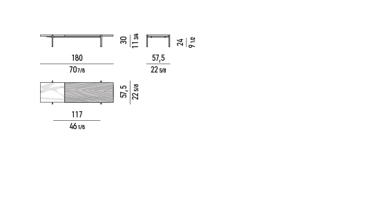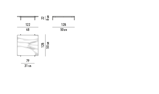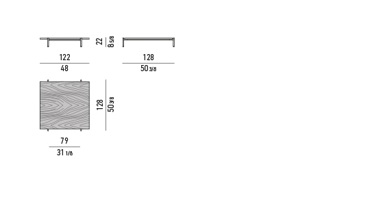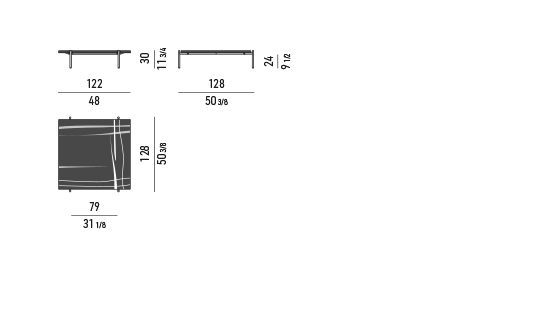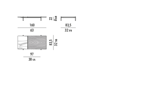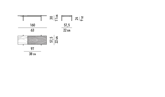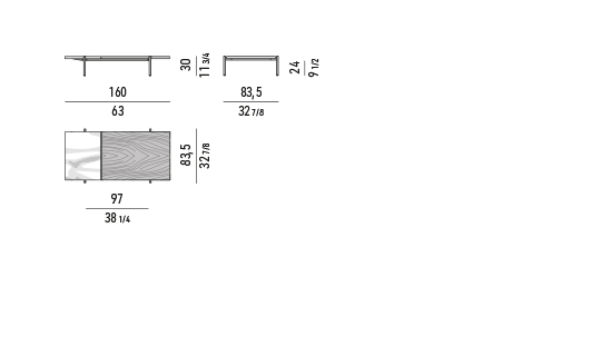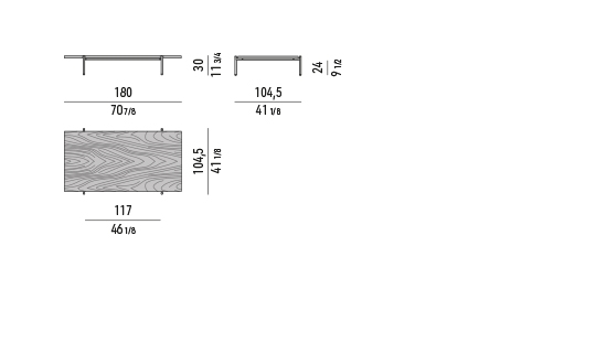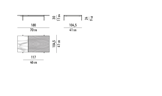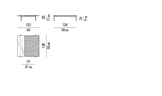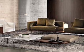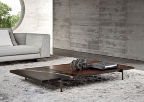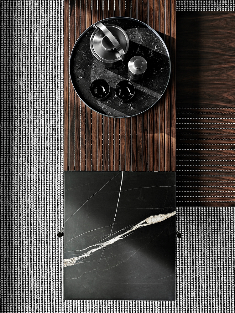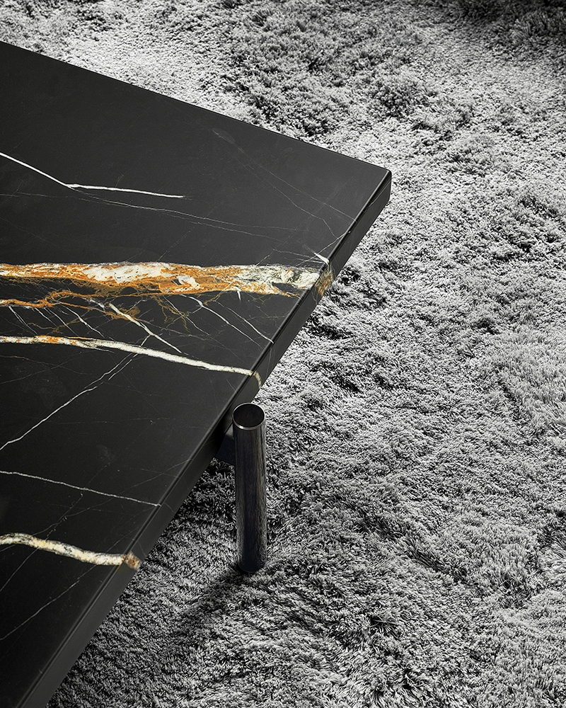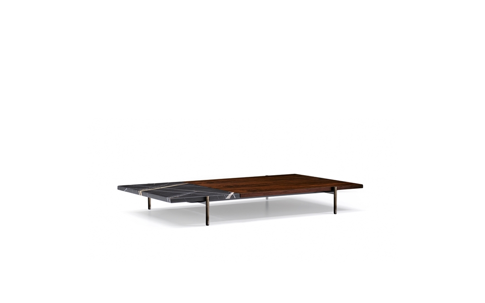 咖啡桌呈方形或矩形,有两种高度可选,桌面采用折叠工艺 Calacatta 大理石和哑光聚酯漆面 Sahara Noir 大理石制成,面板有深棕色卡纳莱托核桃木细条或哑光聚酯漆面深棕色 Santos 酸枝木单板两个版本。在大理石与实木组合版本中尤为明显,质感十足的配件与桌面外观形成美学对比。