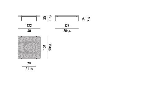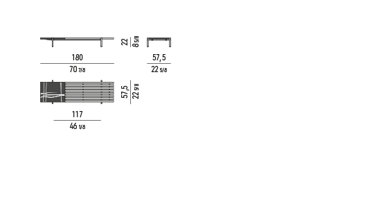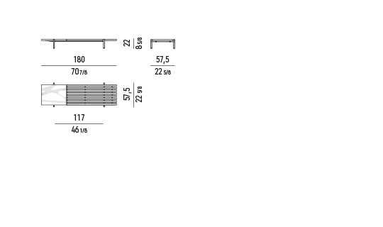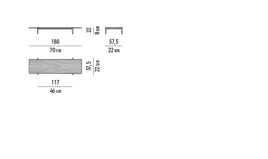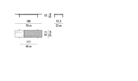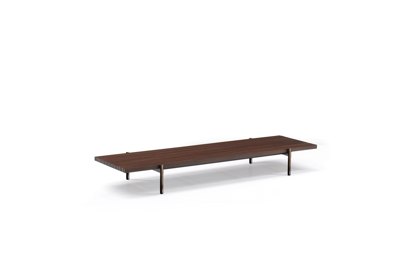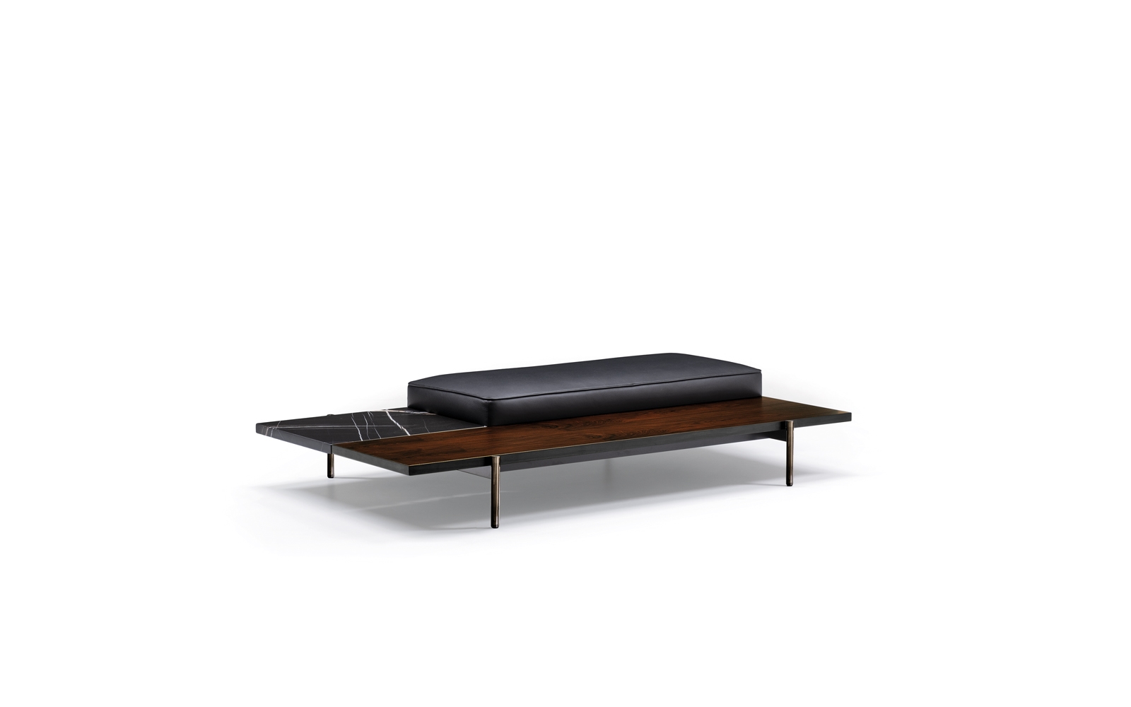 长凳搭配不同厚度的衬垫,有34和42厘米两种高度可供选择,并有四种组合形式:全织物或全皮革覆层 (126x128厘米)、深棕色 Santos 酸枝木面板覆层座位(126x128厘米)、Calacatta 或 Sahara Noir 大理石面板组合座位(182x58厘米),以及实木和 Calacatta 大理石/实木和 Sahara Noir 大理石双面板(182x102厘米)。