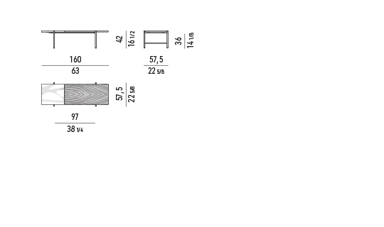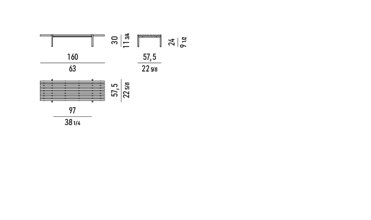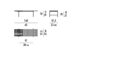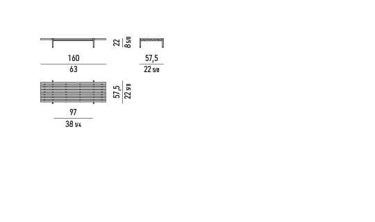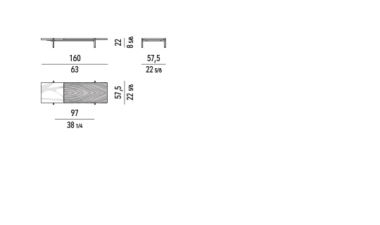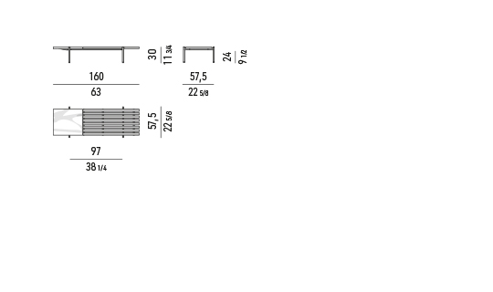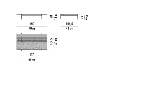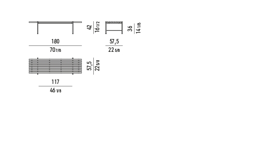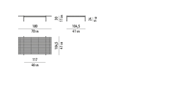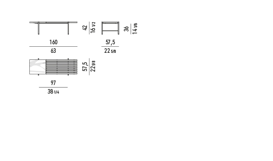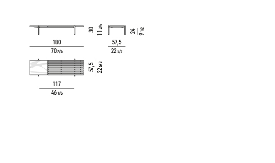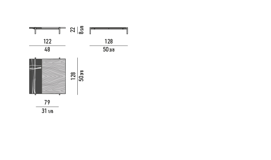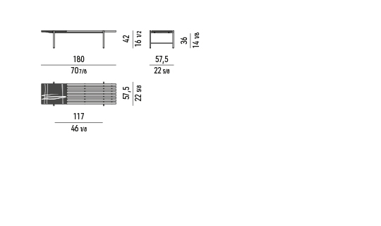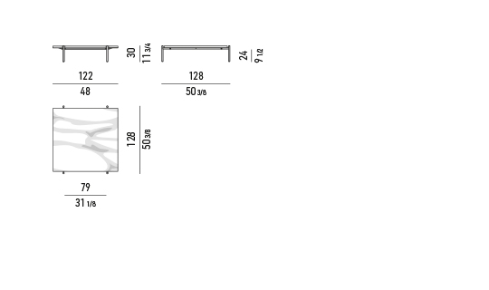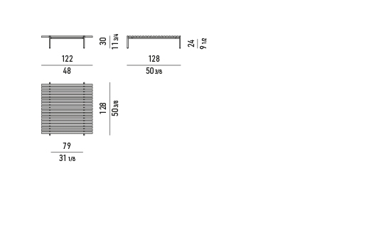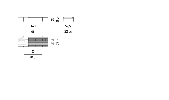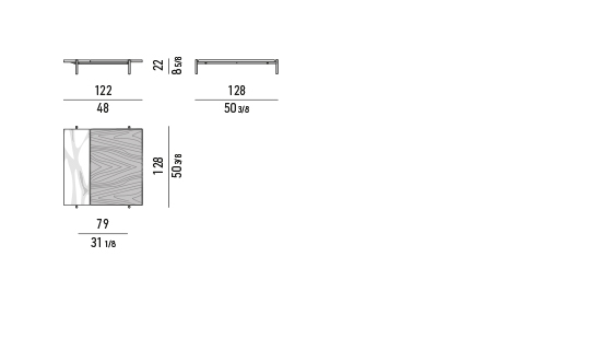 长凳搭配不同厚度的衬垫,有34和42厘米两种高度可供选择,并有四种组合形式:全织物或全皮革覆层 (126x128厘米)、深棕色 Santos 酸枝木面板覆层座位(126x128厘米)、Calacatta 或 Sahara Noir 大理石面板组合座位(182x58厘米),以及实木和 Calacatta 大理石/实木和 Sahara Noir 大理石双面板(182x102厘米)。