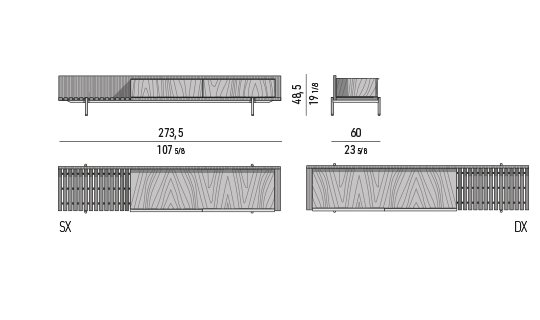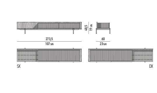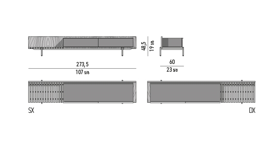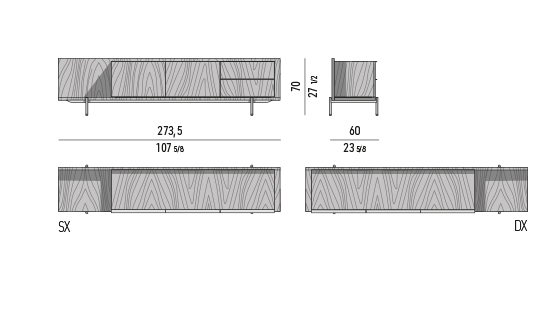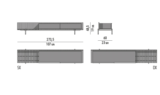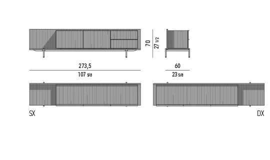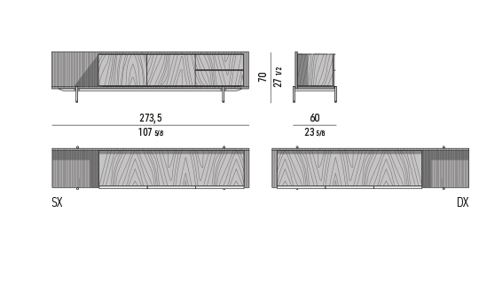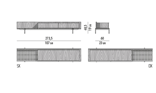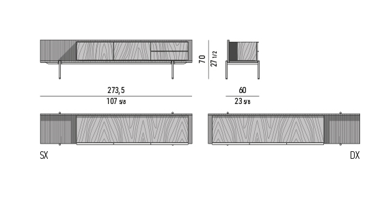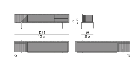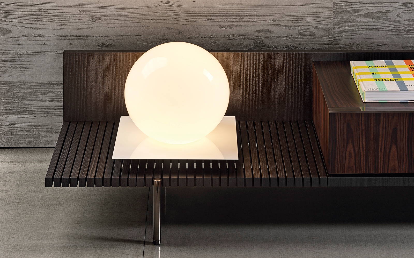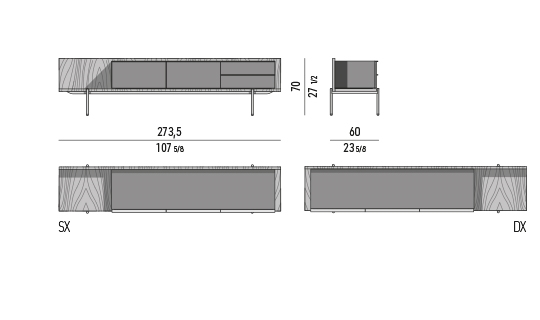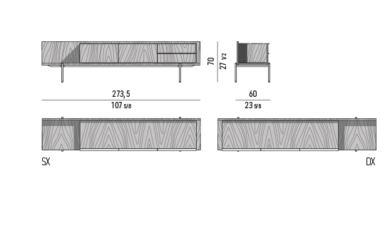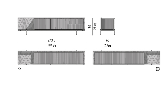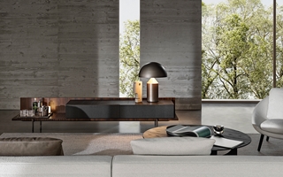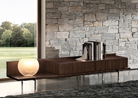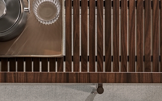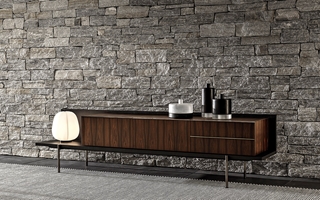 客厅/电视柜采用273.5厘米的单一尺寸设计,搭配附带两个抽屉的储物隔层,深棕色卡纳莱托核桃木细条支撑台面减轻了整体的量感,营造出别有韵味的透视效果。