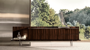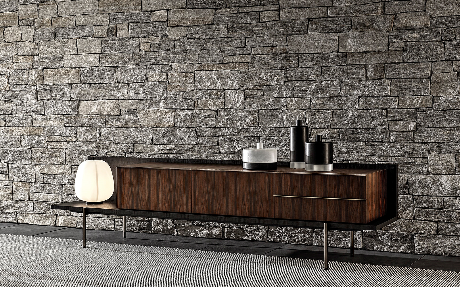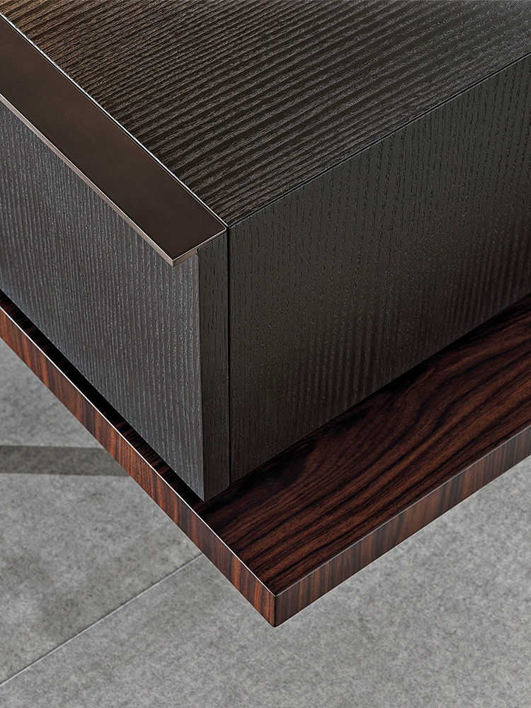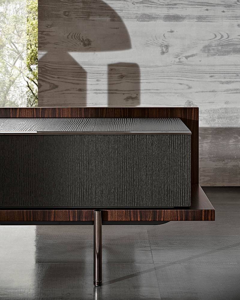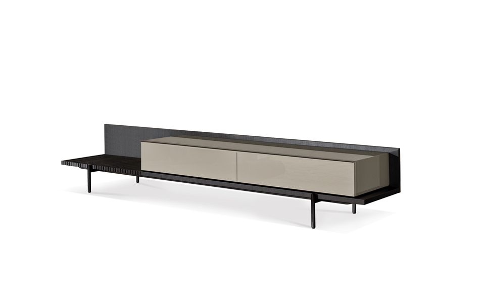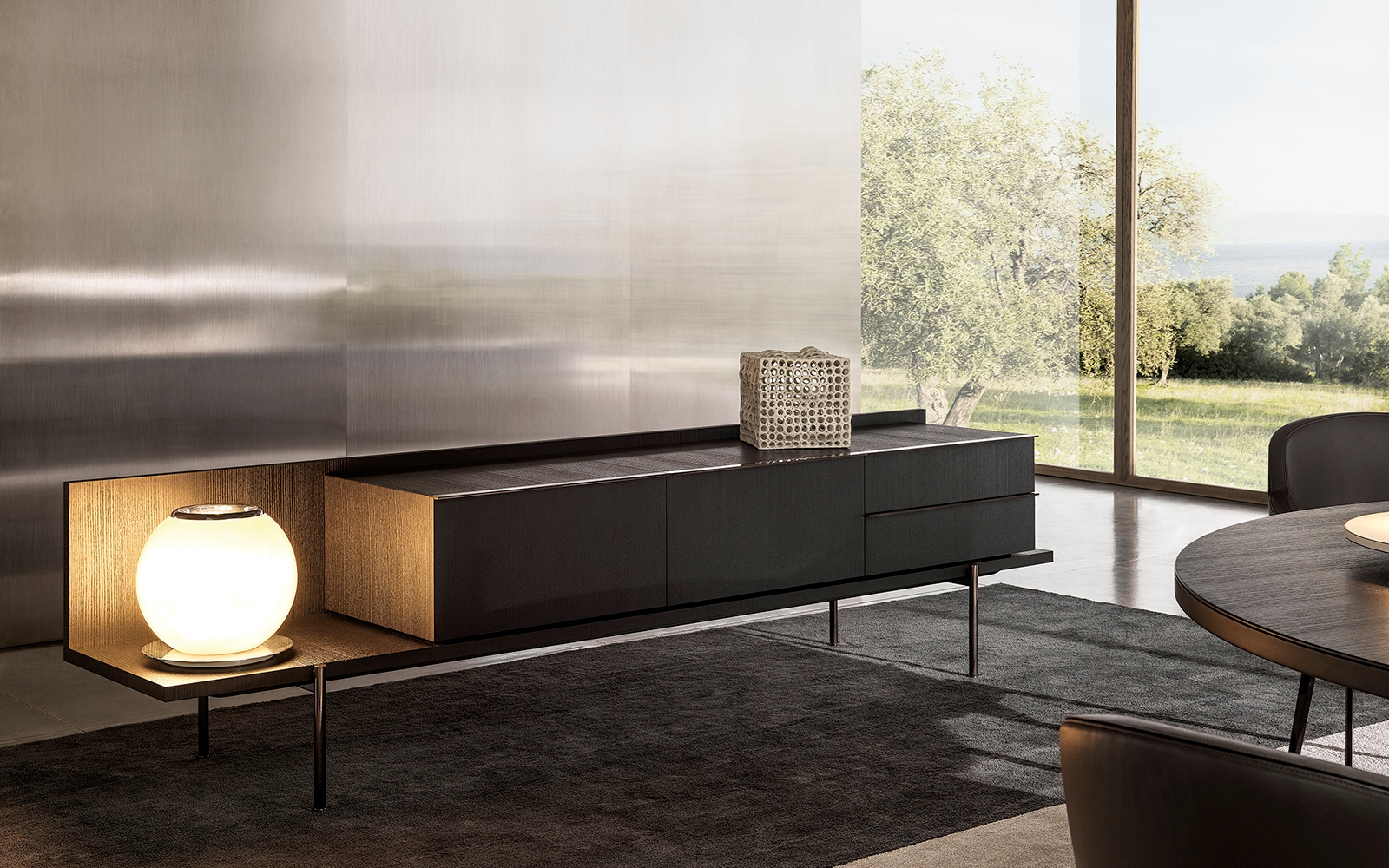 餐边柜和客厅/电视柜的支撑结构采用哑光聚酯漆面深棕色 Santos 酸枝木或黑色开孔漆面梣木制成,配有 Brandy 色亮泽支脚。除哑光聚酯漆面深棕色 Santos 酸枝木、黑色开孔漆面梣木外,餐边柜和客厅/电视柜亦有 Moka 色、卡布奇诺色和孔雀绿色的亮泽漆面版本可选。