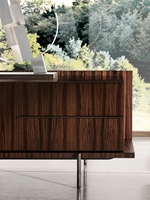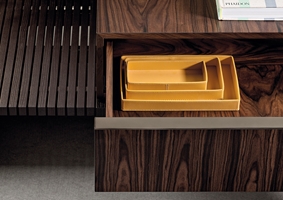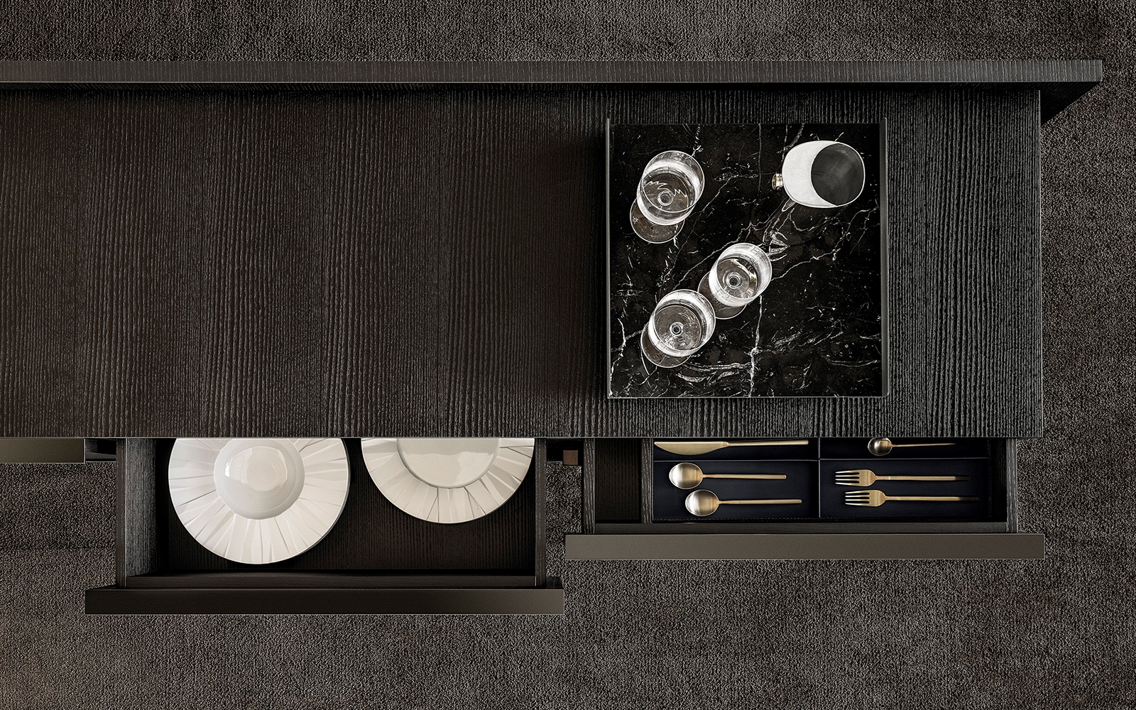 - in MDF, 22 mm thick, Moka colour glossy lacquer finish. Large drawers (n. 2) and drawers (n. 2) that glide on full-extension runners with Blumotion closure. Aluminium handles with varnished polished Brandy colour finish. Black saddle-hide cutlery tray is located in the upper drawer.
