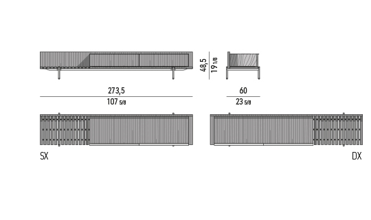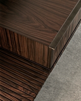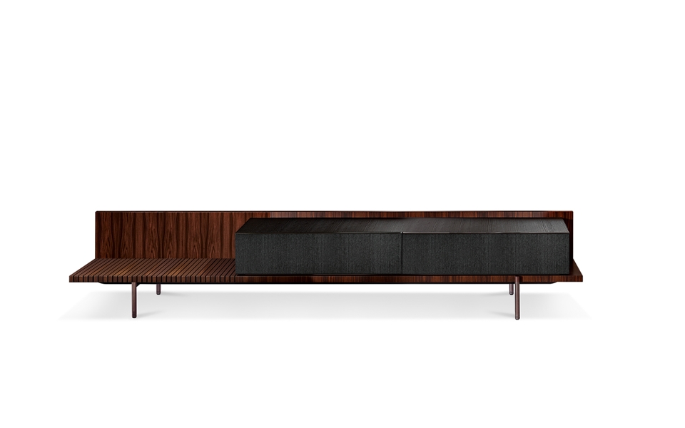 - in MDF, 32 mm thick, with palisander Santos* veneer, stained Dark Brown with polyester matt lacquer finish, and 31x21 mm solid Canaletto walnut slats, stained Dark Brown with polyester matt lacquer finish;