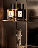 单一尺寸储物柜长105厘米,柜框配有夹层玻璃柜门,内设镀铜金属网格覆层,充分展现古铜色镜面背板与两侧双排灯带营造的光影效果。柜体内设哑光聚酯漆面深棕色 Santos 酸枝木抽屉。两个储物柜并排放置的布局亦能为整体空间带来新的趣味。