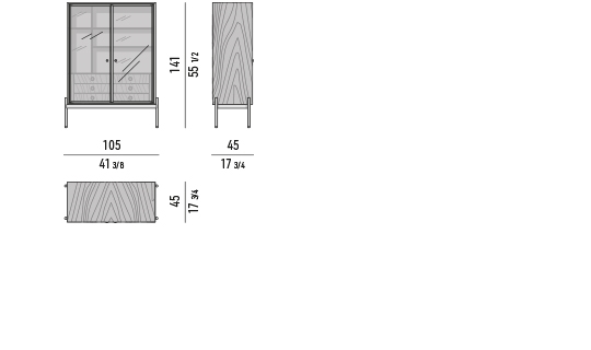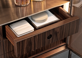 - in laminated MDF and aluminium, 16 mm thick, with palisander Santos* veneer, stained Dark Brown with polyester matt lacquer finish; Door frames in aluminium with varnished polished Brandy colour finish, doors in 3+3 mm bronzed colour laminated glass with internal copper colour metal mesh. Internal shelves (n. 2) in satin-finish aluminium with varnished polished Brandy colour finish. Drawers in MDF with palisander Santos* veneer, stained Dark Brown with polyester matt lacquer finish, with solid wood handle and metal handle plate with varnished polished Brandy colour finish. Back interior in bronzed mirror, 5 mm thick. Inside the cabinet, along the sides are n. 2 LED strip lights with on/off switch (wall socket feed).
