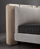 靠垫通过华贵的皮革绑带固定在床头。睡床搭配精致的Pewter色漆面的压铸铝支撑脚。