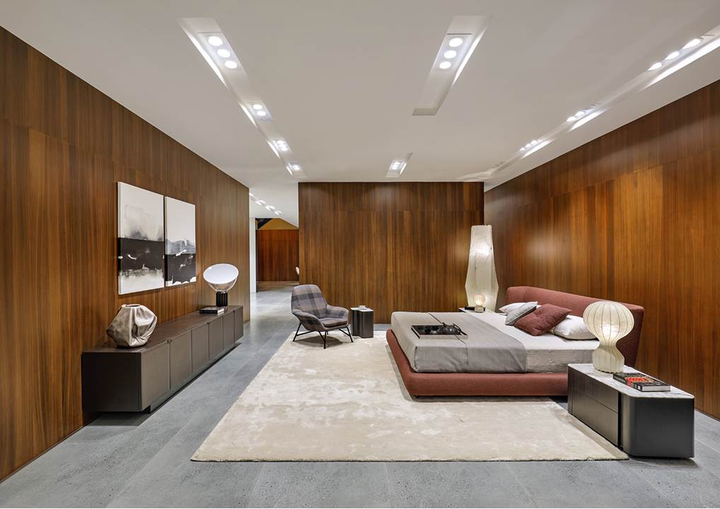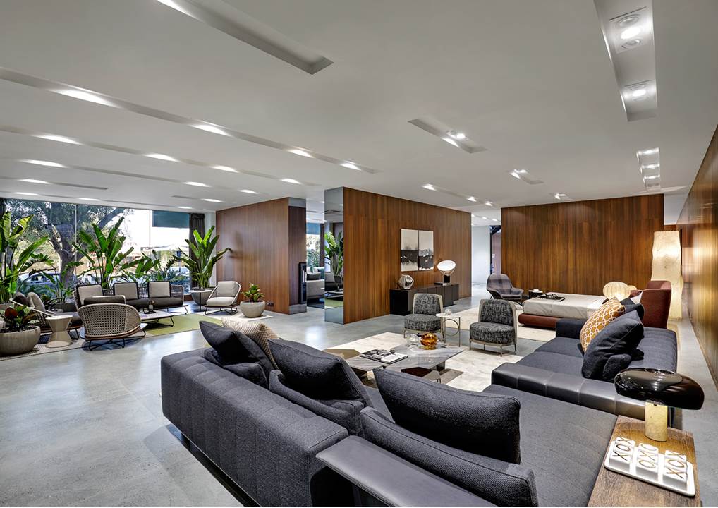 灰色的混凝土地板、白色的石膏天花板、暖色调的墙板打造出一个优雅的空间,设有一系列迷人的客厅、餐厅、卧室和户外区域,摆放着品牌的畅销品、最新系列的代表作、2020系列的室内家具,其中包括Rodolfo Dordoni设计的Connery沙发座椅系列、Marcio Kogan / studio mk27设计的Daiki扶手椅和Boteco边几。