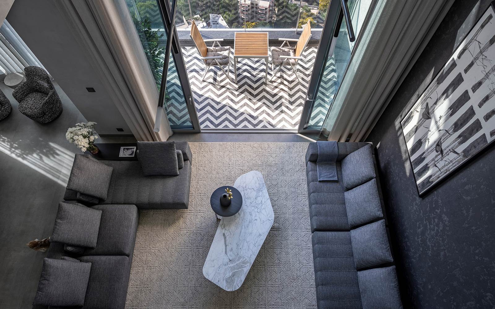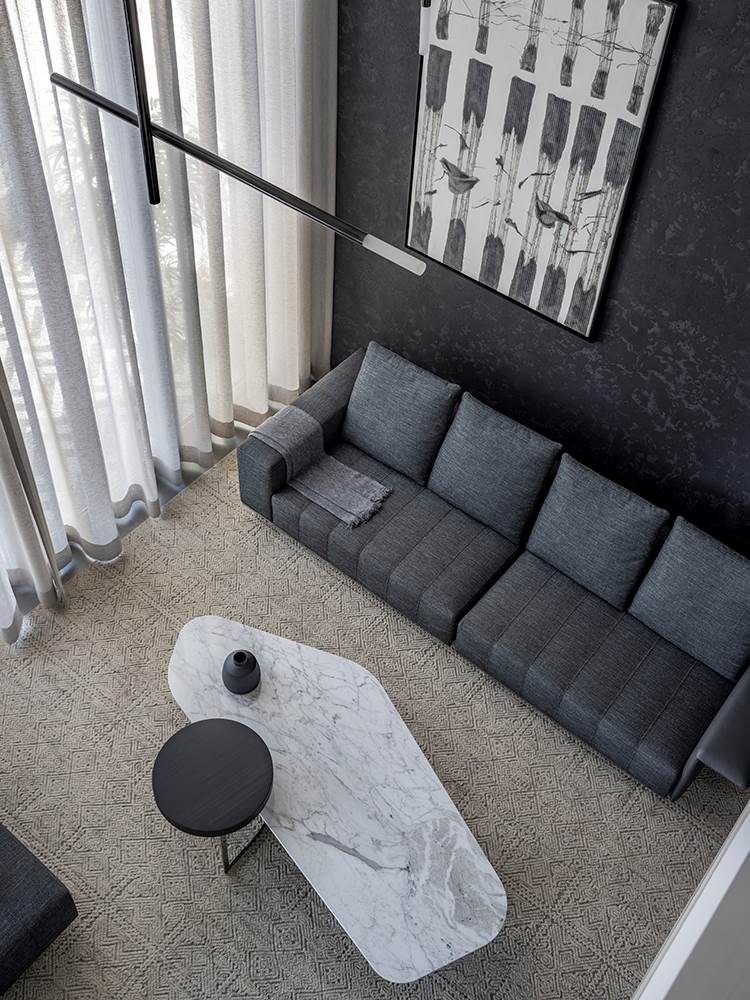 从上层可以俯瞰下层,上层有一个更加私密的起居空间,Blazer沙发座椅系列搭配Jacob边几,打造出一隅舒适的角落,成为休闲放松的理想空间。