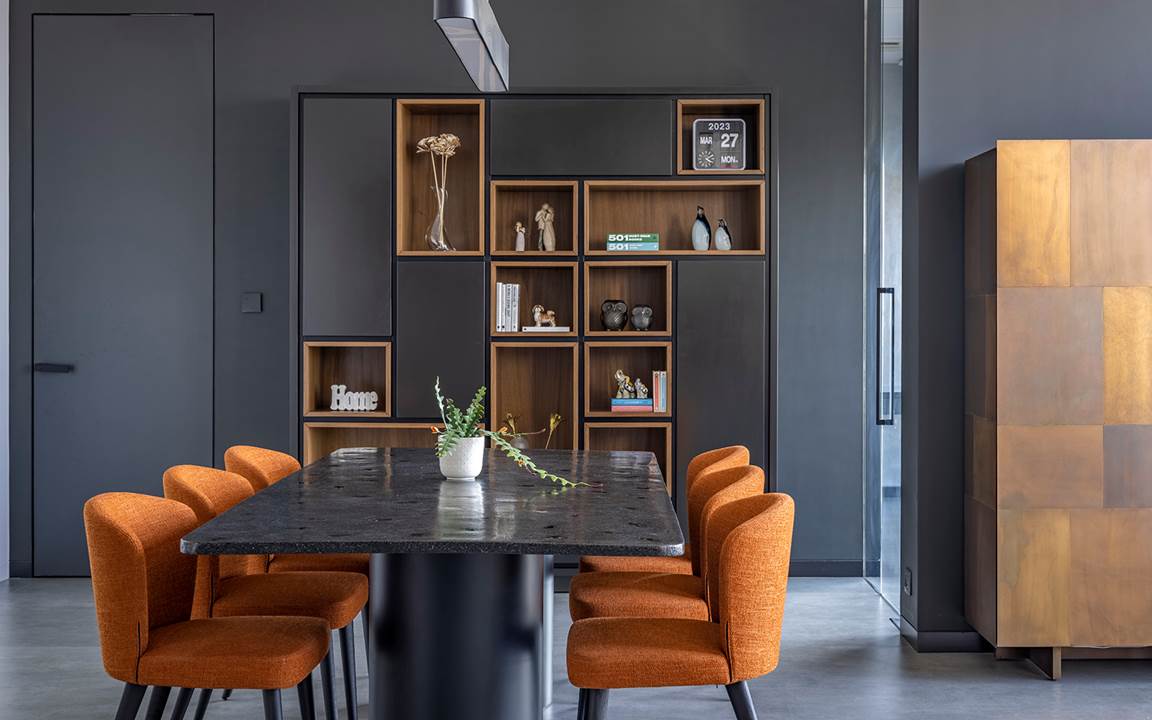 用餐区与客厅相邻,选用的Aston "Dining"餐椅呈现出永恒的设计感,为空间注入一抹色彩与个性,交谈区则摆放着比例精巧的Jacques座椅,带来一种现代复古风格。