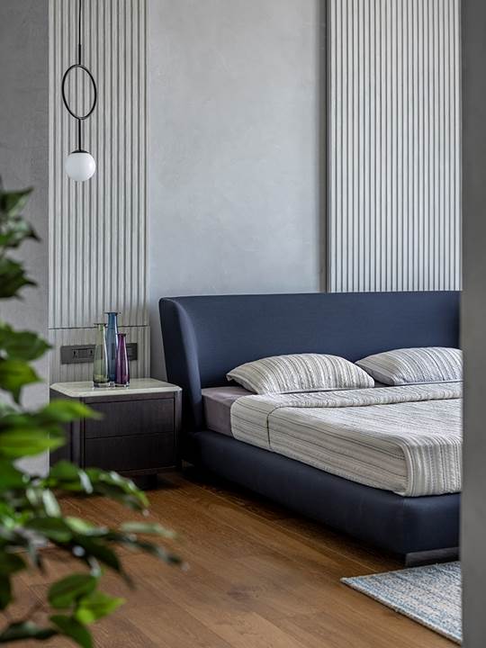 主卧室的家具主角是Reeves Bed睡床,两侧摆放着Milton床头柜,环抱式设计的床头板给人一种温暖拥抱的感觉,深邃的蓝色调与房间的简约风格形成对比效果。