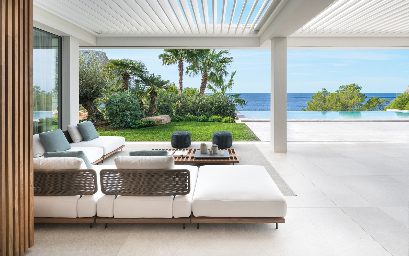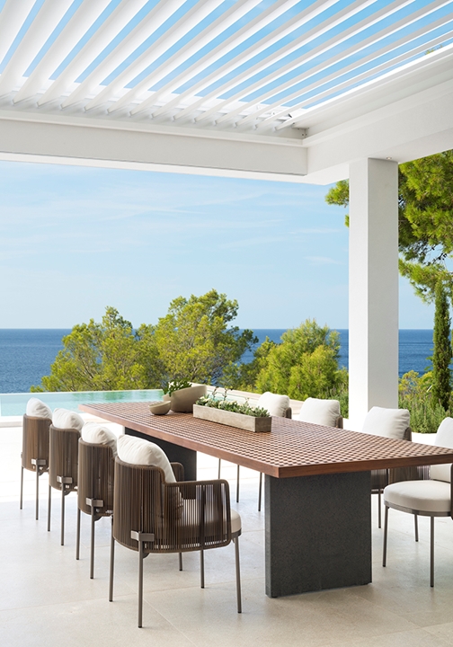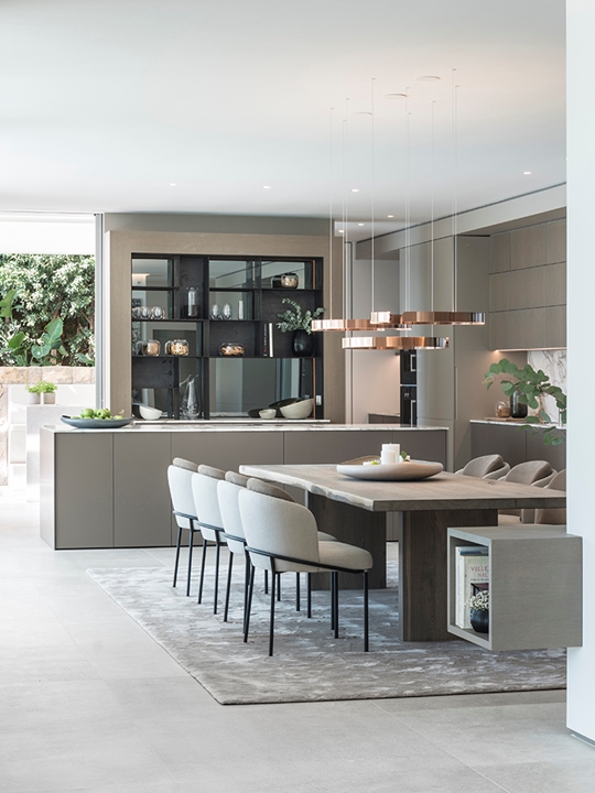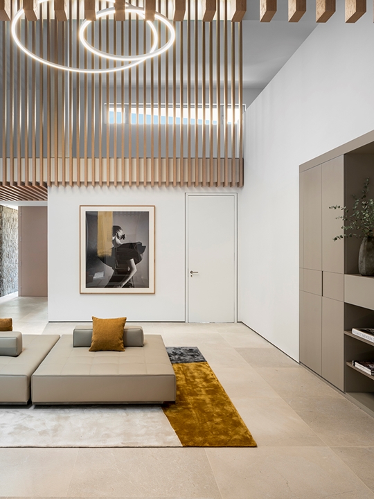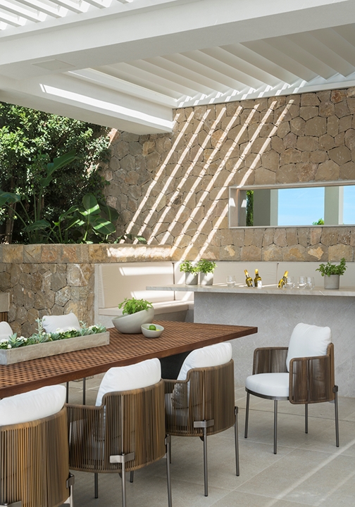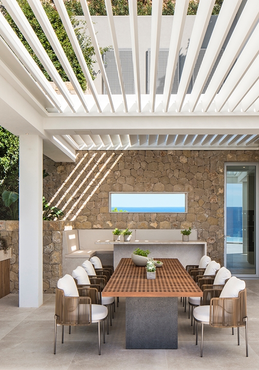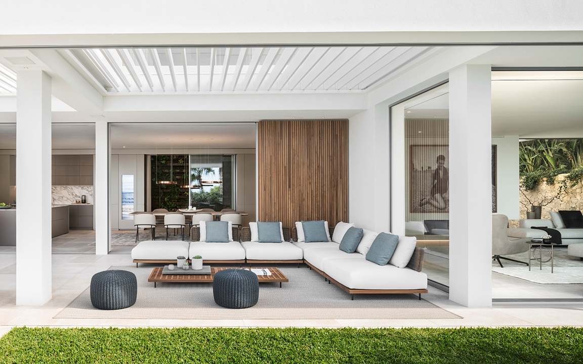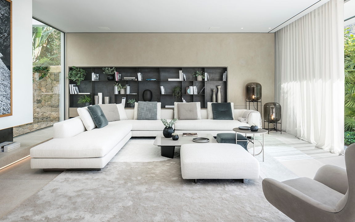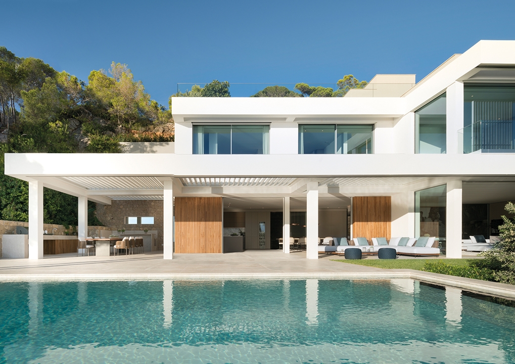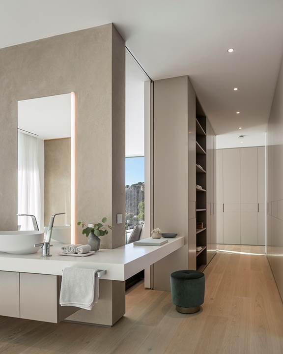 这栋别墅及相邻的客宿面积达到900平方米,这里是马略卡岛最让人梦寐以求的地段之一。该项目由建筑师Achim Marwitz与著名的西班牙室内设计事务所Terraza Balear合作设计,这家事务所也是Minotti在巴利阿里群岛的独家经销商。两栋房子通过宽敞的露台、开阔花园和无边泳池相连接,海湾和海洋的壮观全景尽收眼底。Terraza Balear设计事务所精选柔和自然的色调和材质,精心打造明亮温馨的室内空间,演绎独特的美学,诠释永恒的优雅,描绘地中海的宁静氛围。