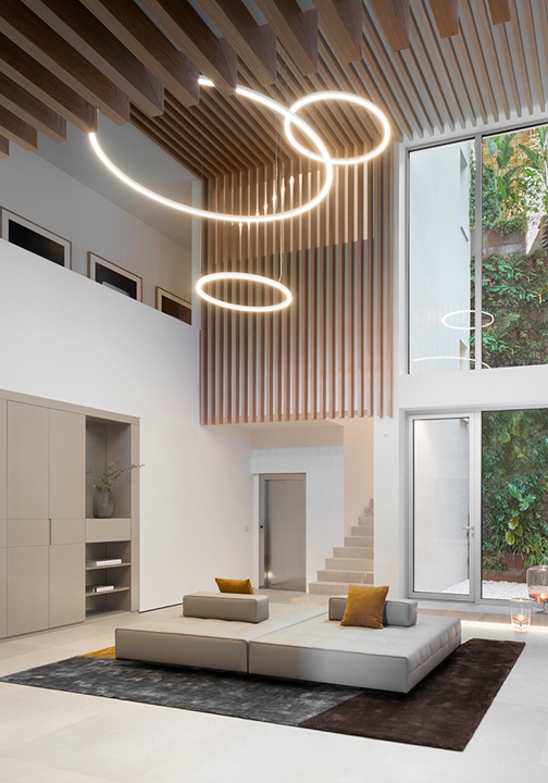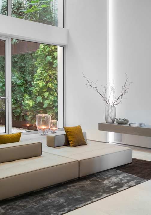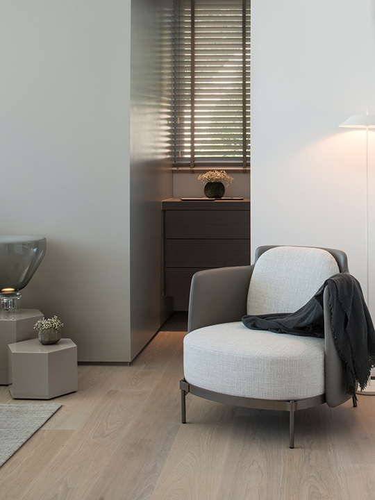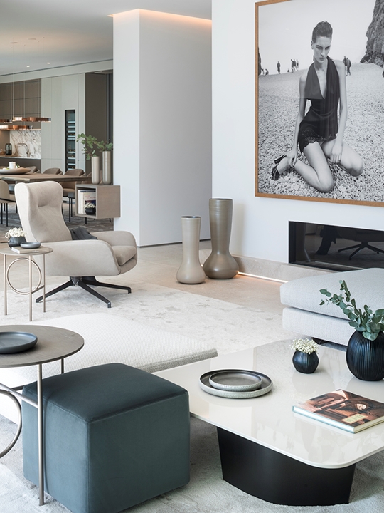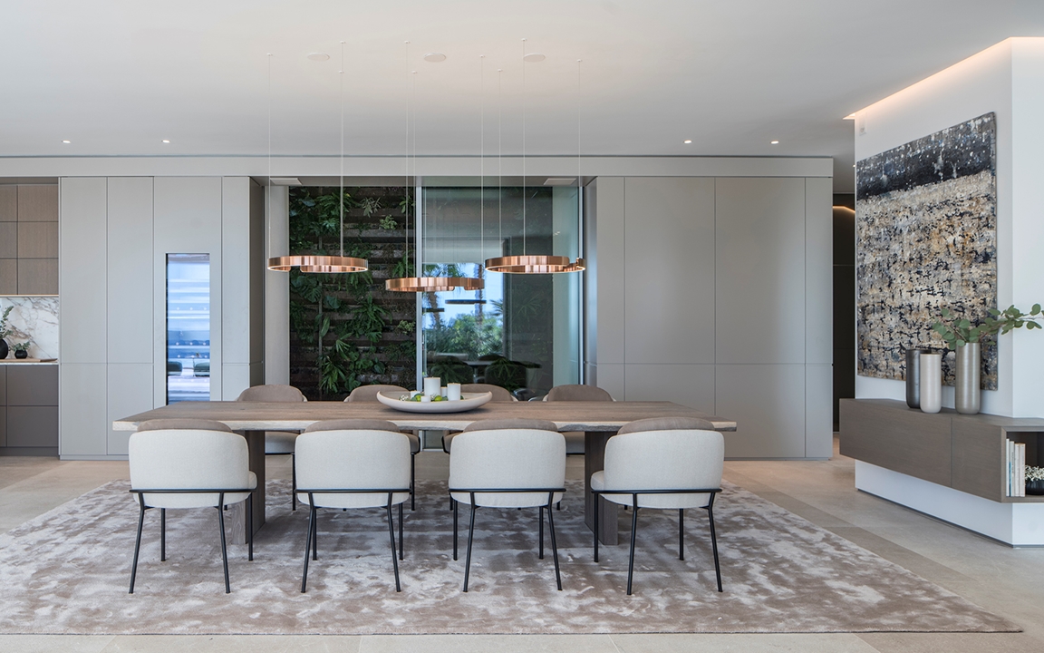 在住宅入口处,建筑的特点在于非比寻常的高度,因而在空间中十分引人注目。浅色的橡木天花板温暖拥抱整个空间,两个精致的Lawrence Clan椅凳摆放在空间中央。客人步入室内,即有机会探索迷人的客厅,这里精选Minotti最新系列的多款作品来呈现家具设计方案。客厅内摆放着Rodolfo Dordoni设计的Alexander沙发座椅系列,优雅的浅色覆面与青墨色和蓝绿色的装饰靠垫形成别致的对比效果,沙发旁边是Jensen扶手椅和Ring边几。餐厅则选用优雅的木制餐桌,四周摆放着Christophe Delcourt设计的Fil Noir餐椅。两个空间都透过全景落地窗与户外进行和谐对话,强调室内与户外空间的沟通。
