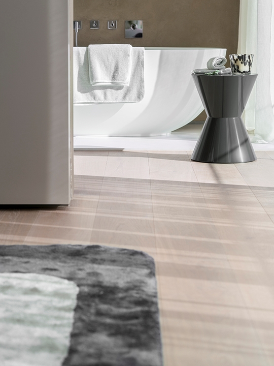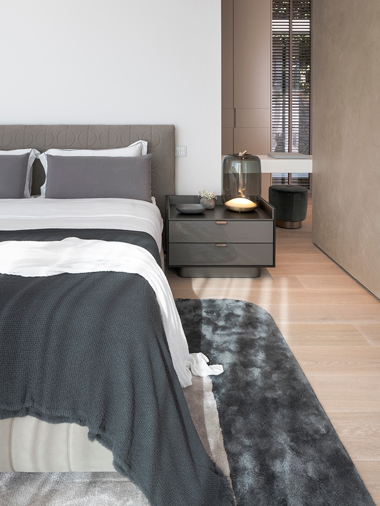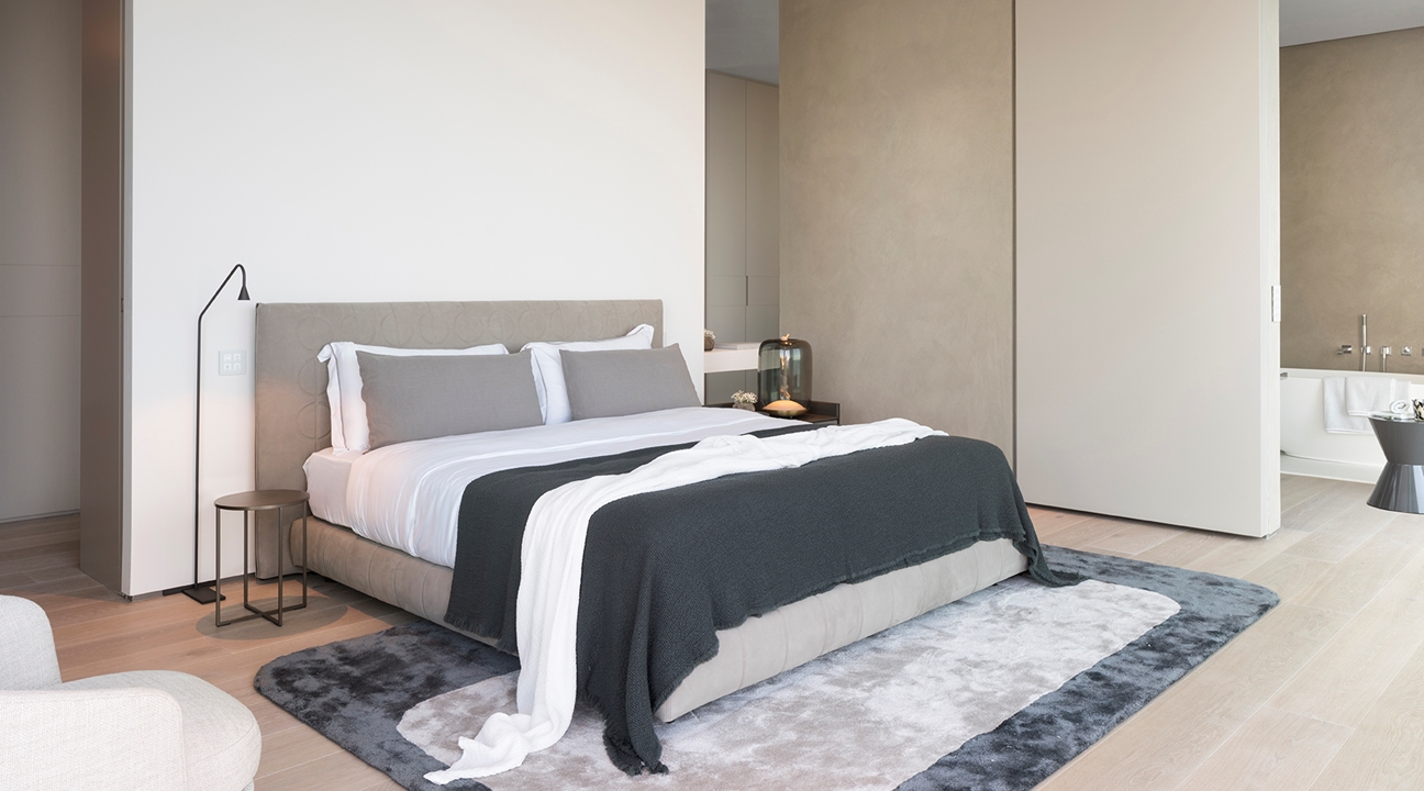上层是卧室区,这里可以欣赏到迷人的海景,充满与整个住宅相同的优雅温馨的氛围。主卧室的主角是由Rodolfo Dordoni设计的Curtis床,几何图案的床头板别具一格,旁边摆放着Jacques扶手椅、Noor和Duchamp边几,搭配众多配件和配饰。与卧室相连的私人浴室可以立即将此处变成私人水疗中心。