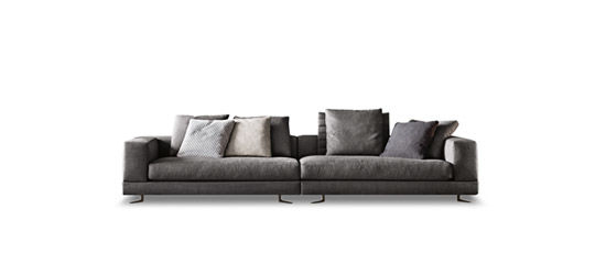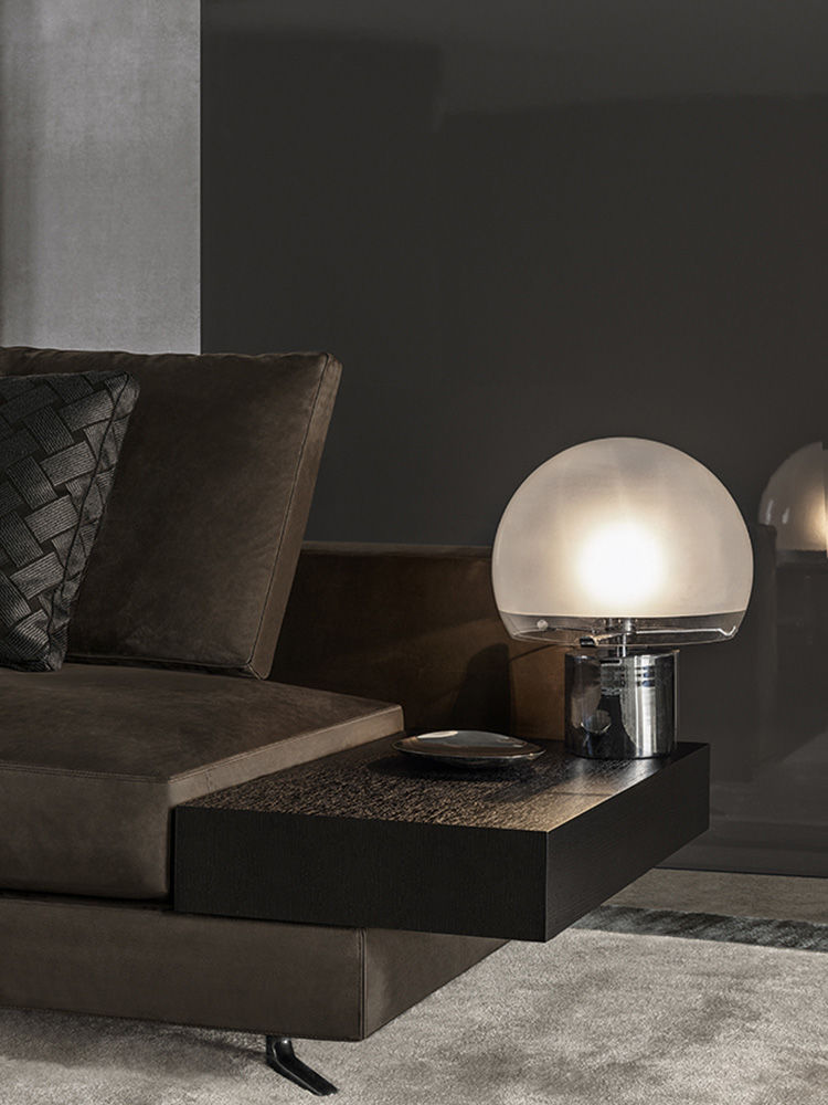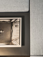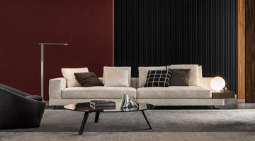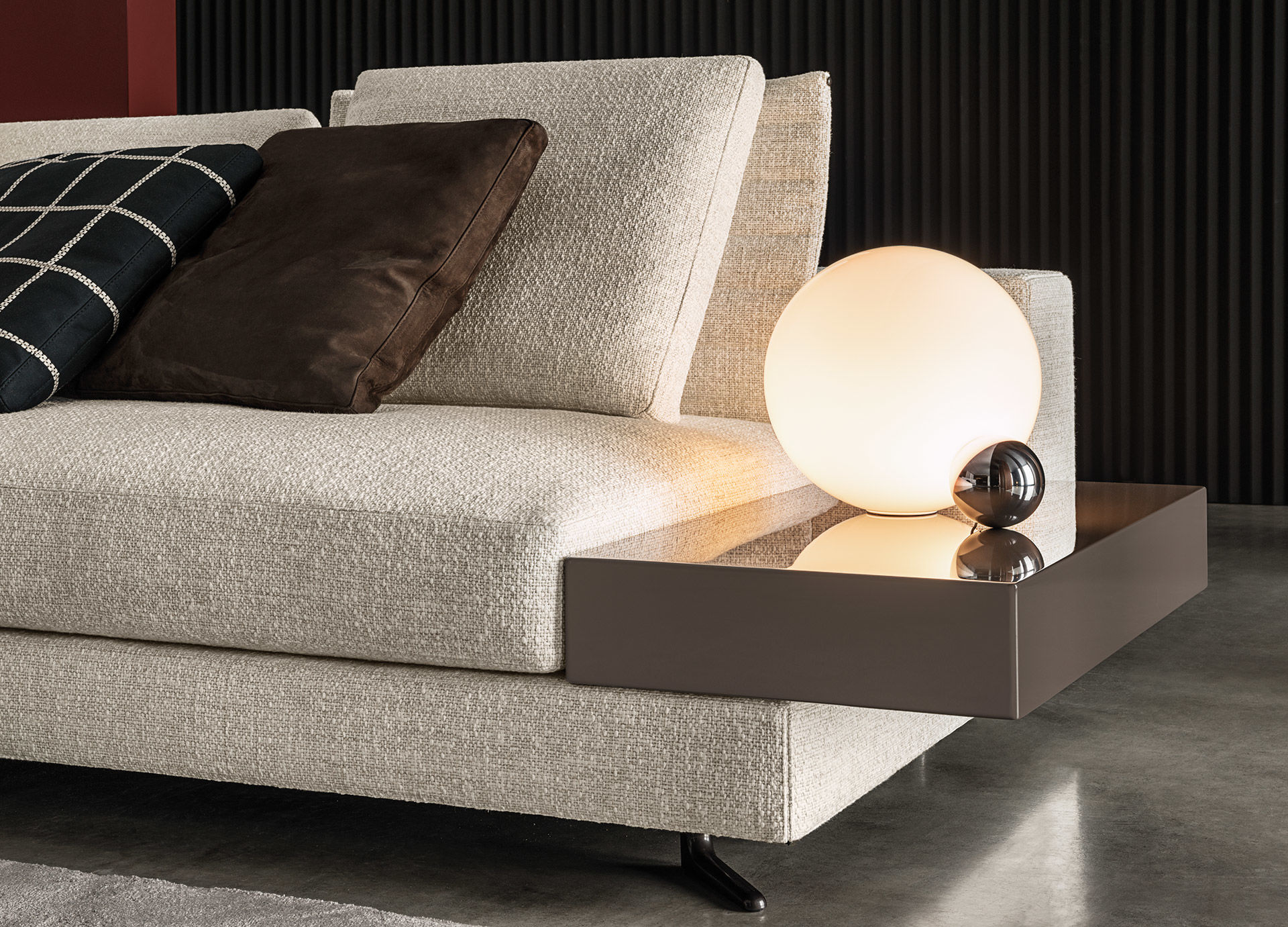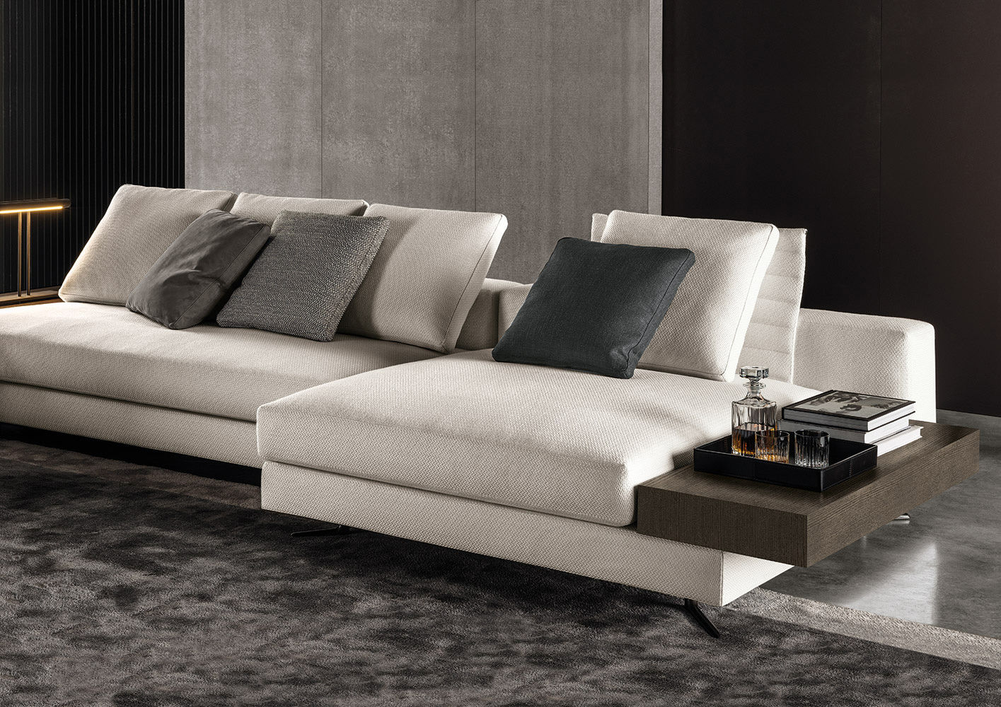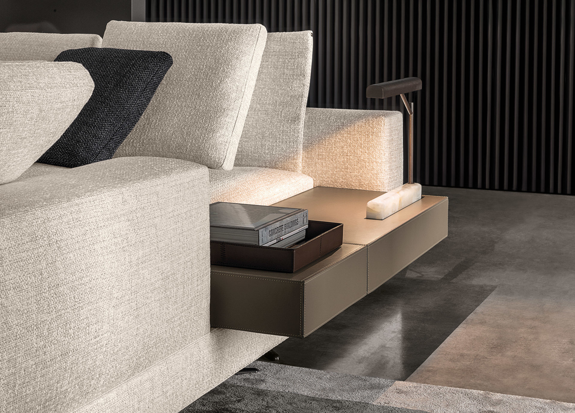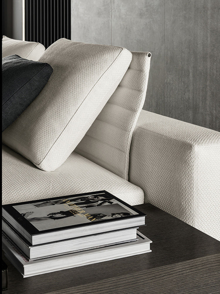 沙发的底座可以包覆布料或皮革,靠背、坐垫和置物表面层叠排列,打造出颇有趣味的造型游戏,在虚实之间交替变换。沙发搭配Pewter色漆面压铸铝支撑脚,此配件由Minotti Studio独家设计,位于沙发角45°的位置,使大型物件也能呈现出轻盈感。为了让White沙发系列更具温馨感,坐垫采用更致密的鹅毛填充,使其格外柔软蓬松,与下方的构架形成令人愉悦的对比效果。