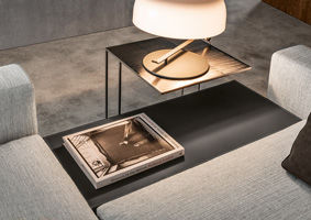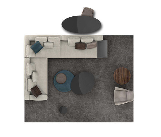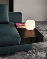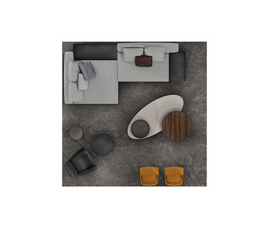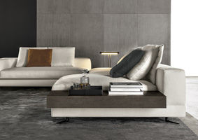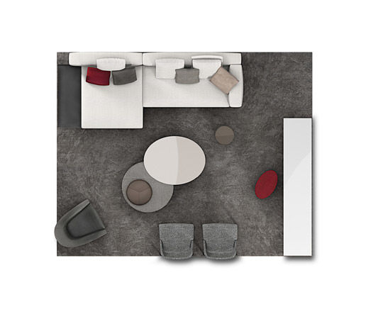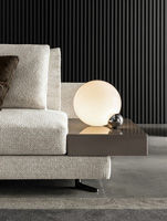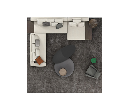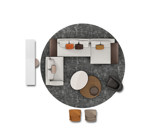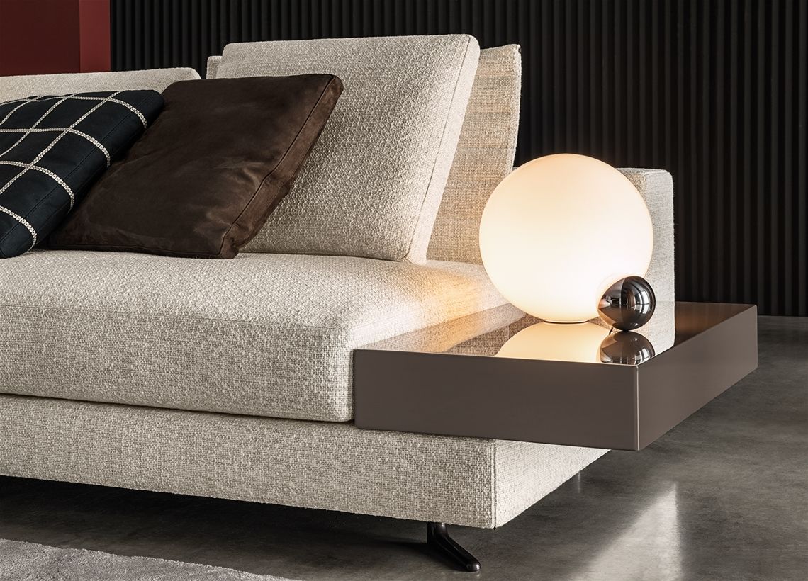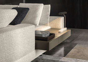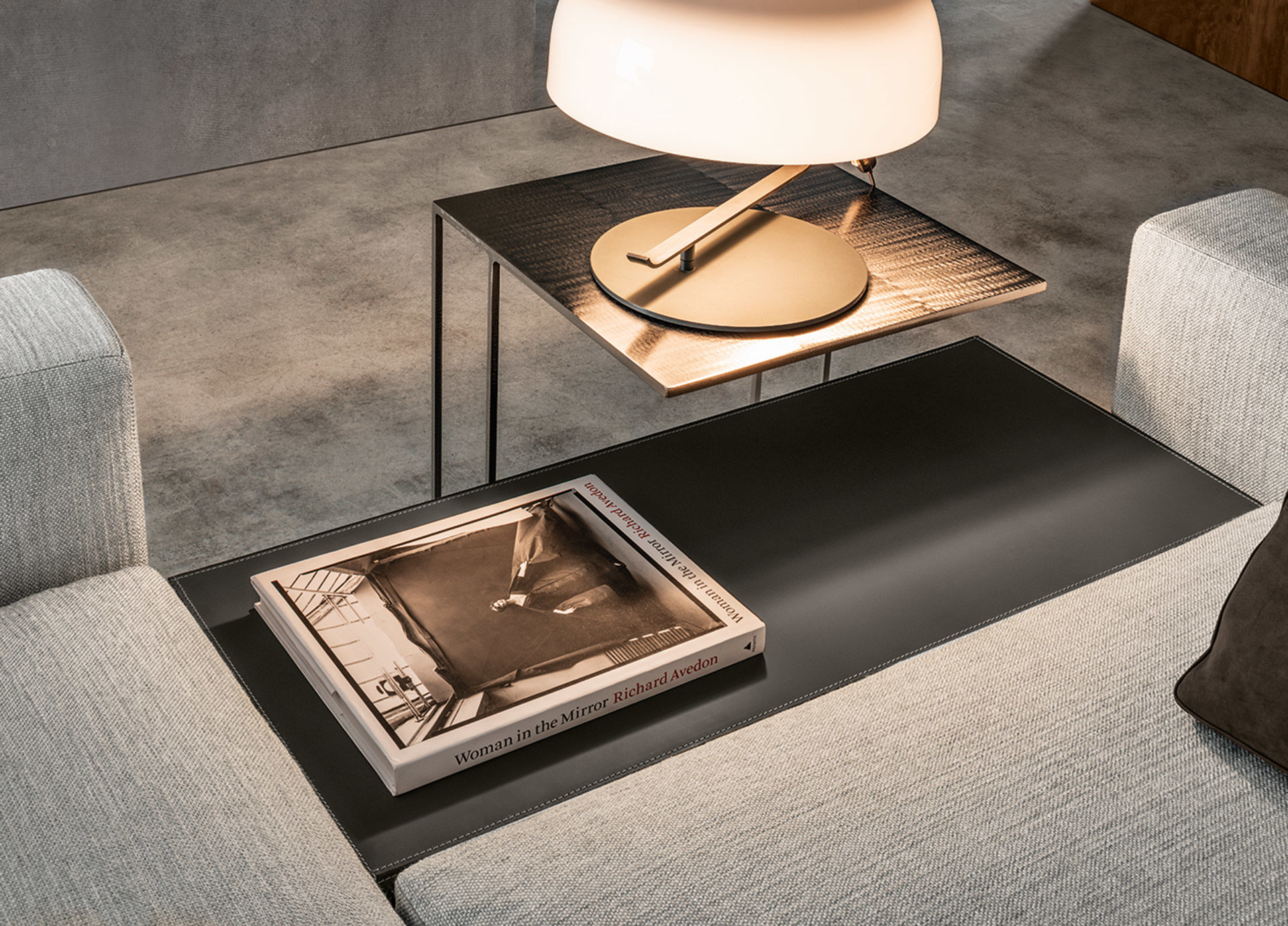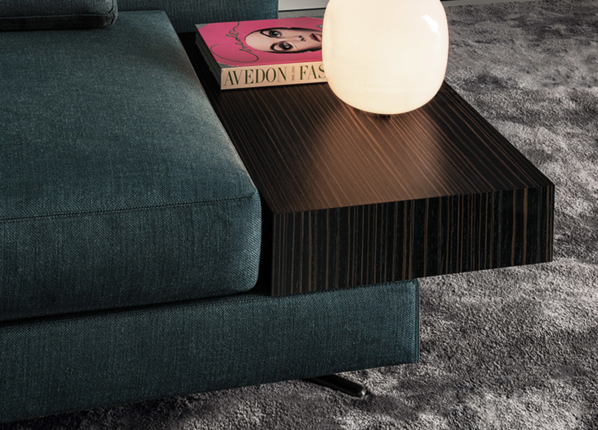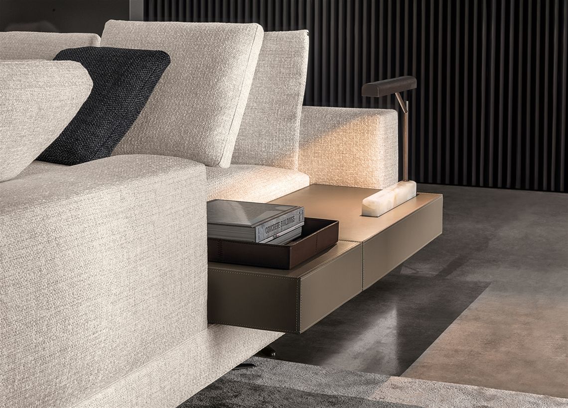 White沙发系列的别致之处还在于可以将扶手换成置物表面,或是在靠背后方添加置物表面,以此来打造富有功能性的组合。置物表面为平行六面体,其厚度与沙发基座的厚度相等,可选饰面有:颜色为深褐色、烟草色、深棕色、灰色和黑色的皮革;颜色为Sand色、深褐色和花岗石色的亮光漆;亚光漆开孔乌木、烟草色和灰色开孔橡木、Moka色和黑色开孔橡木的木饰贴面。