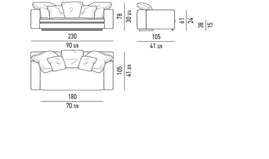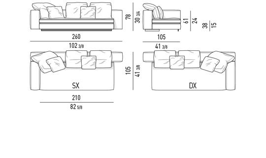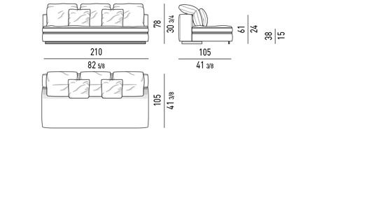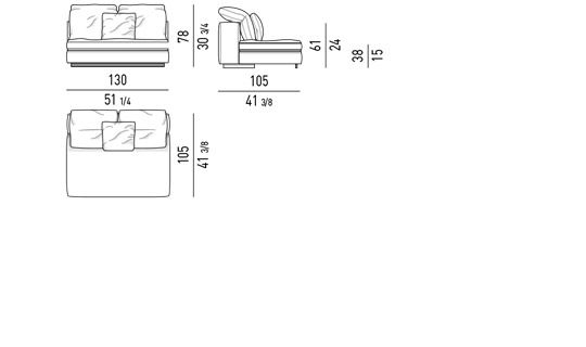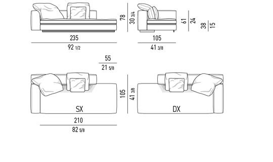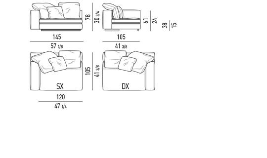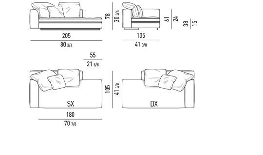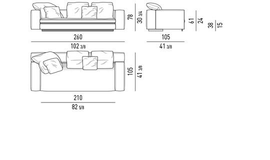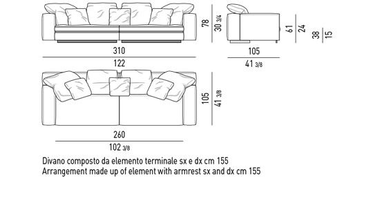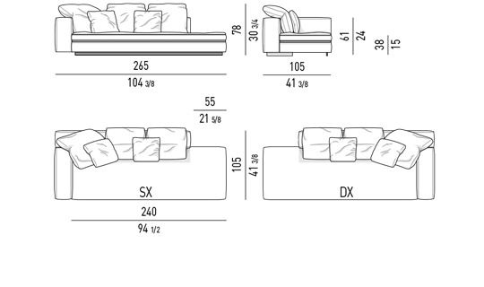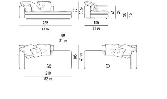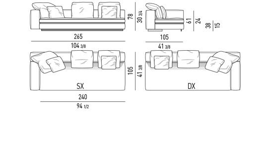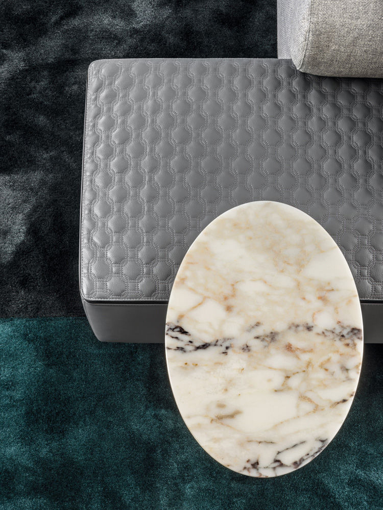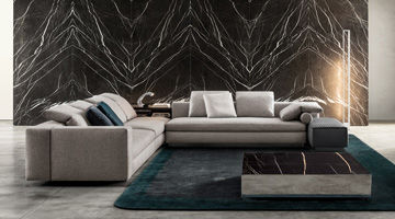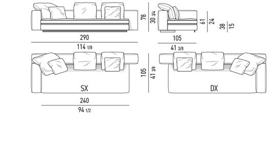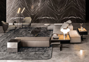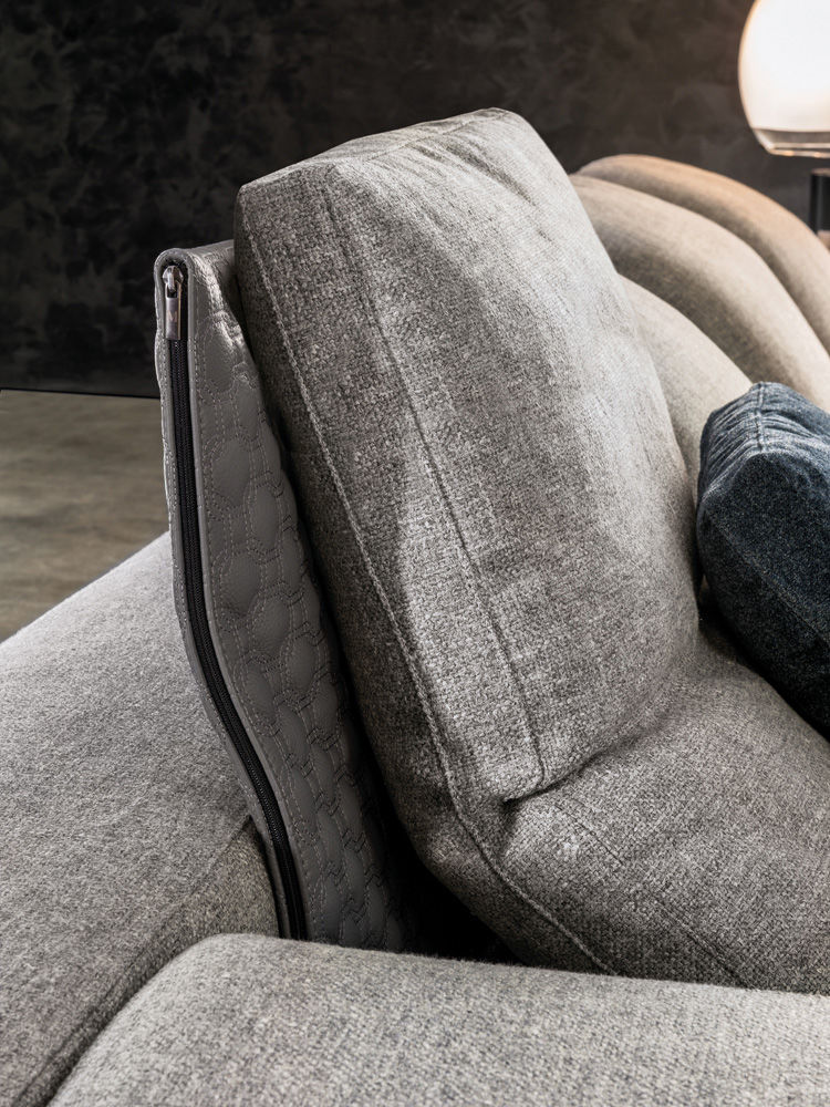 Channeled goose down (certified Assopiuma, gold label) padding for backrests and cushions with center insert in high resilience, variable-density polyurethane foam. Seat cushions are completely reversible.