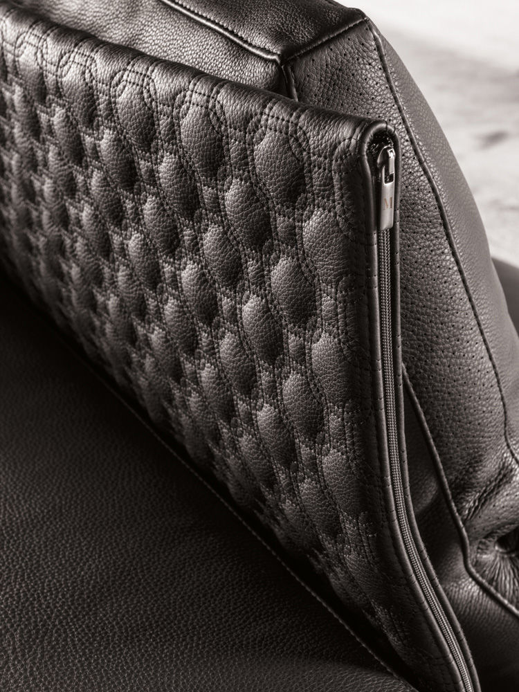 Crafted with an inner structure that is rigid, but flexible. It can easily be positioned between the backrest and the cushions to ensure just the right support. The typical “Cambré” stitching creates an elegant matelassé motif, bringing out the beauty of the fabric or leather upholstery which is fully removable.