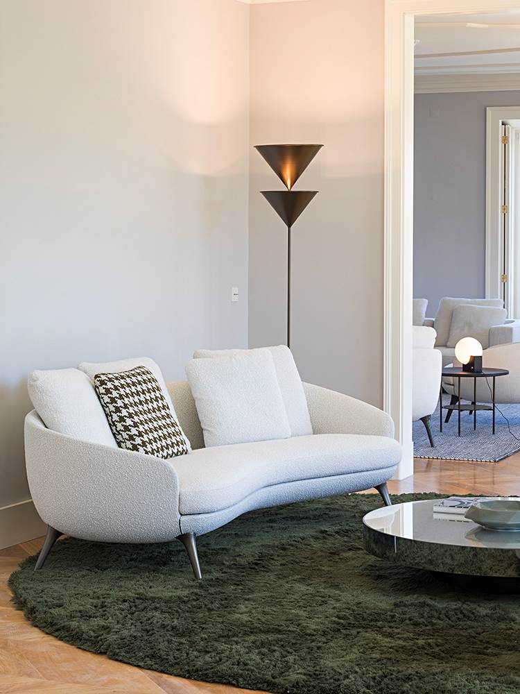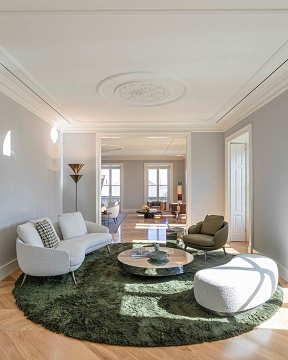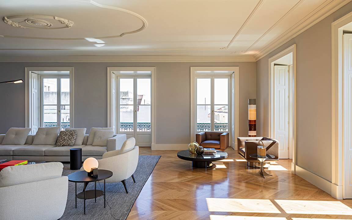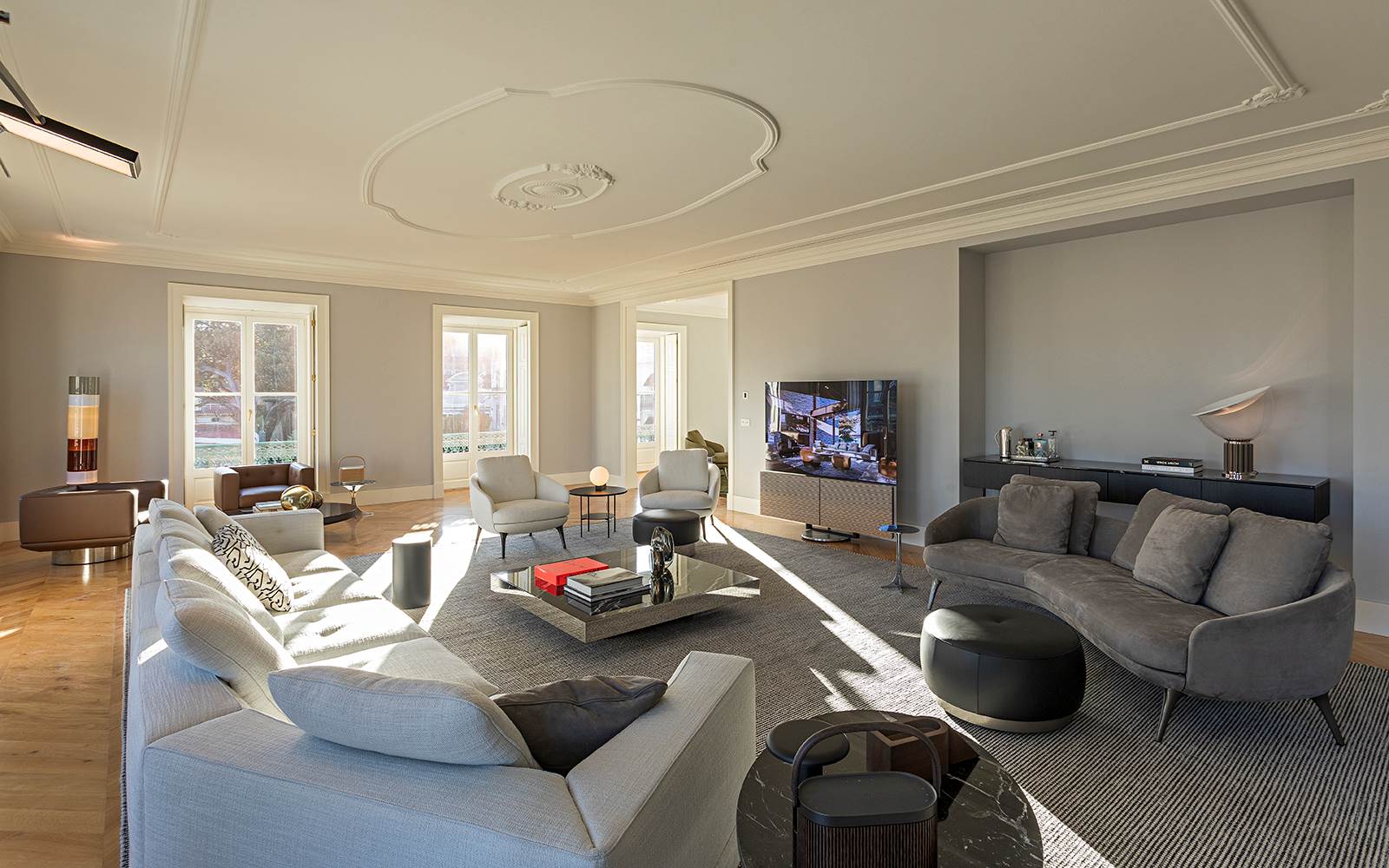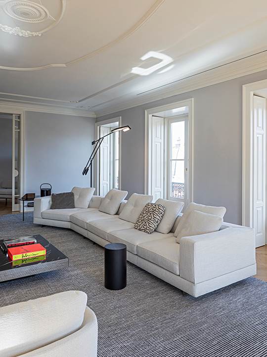 Im historischen Stadtviertel Chiado in Lissabon, dem einstigen Treffpunkt von Schriftstellern und Intellektuellen, verbindet eine wunderschöne Wohnung den zeitgenössischen Stil von Minotti-Möbeln Made in Italy mit dem Charme der romantischen Belle-Epoque-Architektur, in der sie untergebracht ist.