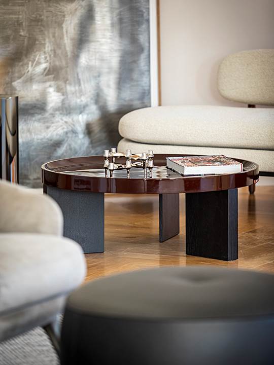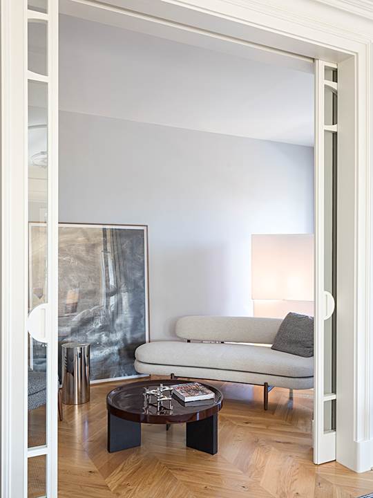 Schließlich mündet das Wohnzimmer in eine kleine Oase der Ruhe, in der die sanften asymmetrischen Kurven des Sofas Lars von Inoda+Sveje zusammen mit dem Couchtisch Louver im Stil der 1970er Jahre von Dordoni stehen.