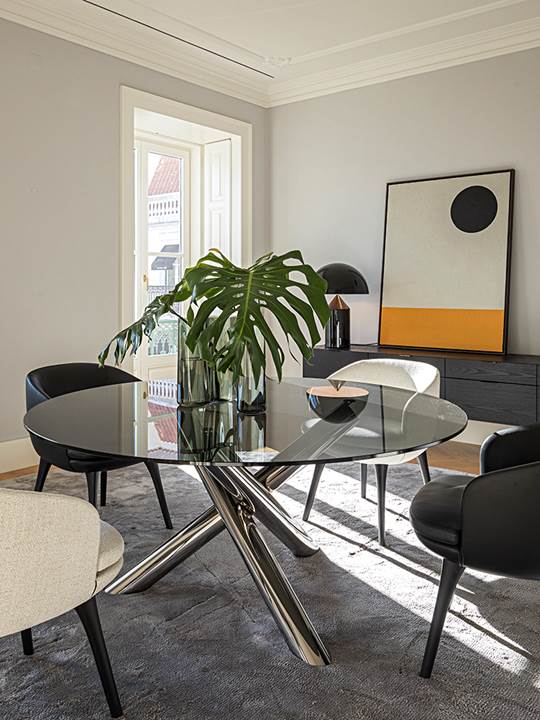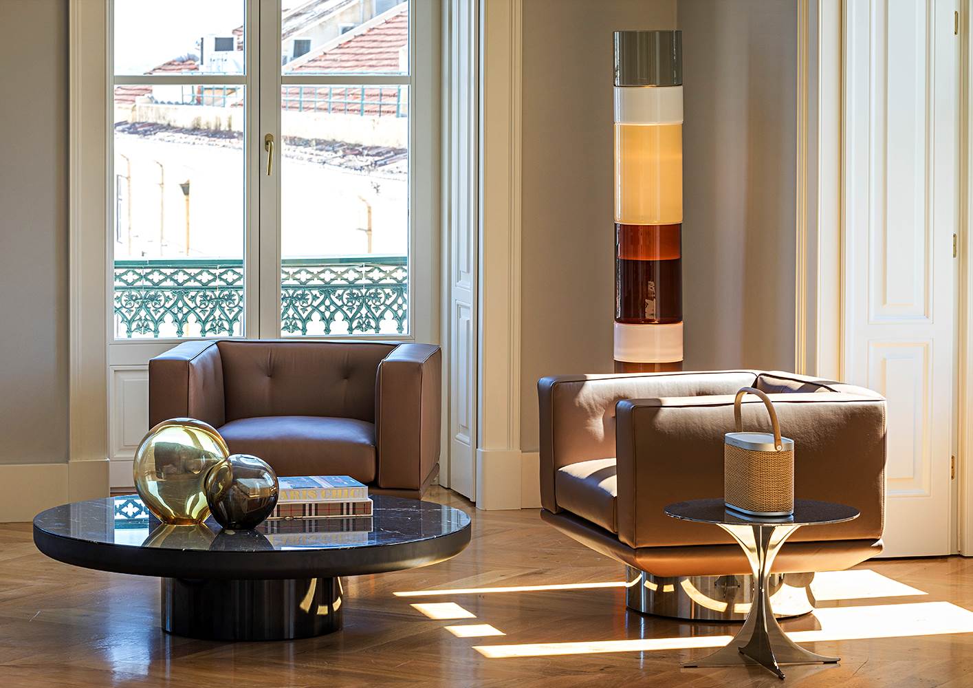 Inmitten der kunst- und geschichtsträchtigen Alleen der portugiesischen Hauptstadt offenbart sich der Dialog zwischen der Ursprünglichkeit der Residenz, die ihre einstige Pracht bewahrt hat, und dem zeitgenössischen Charakter, der die Vorschläge von Minotti auszeichnet, in einer Kombination aus zarten Farbgebungen und akkuraten Materialkontrasten.