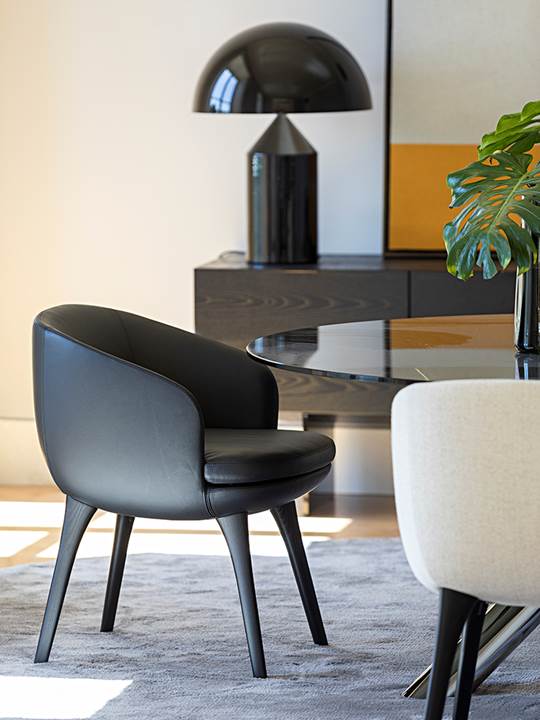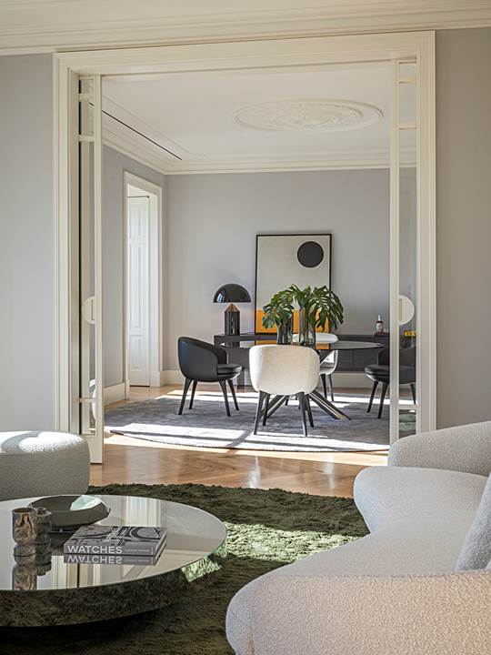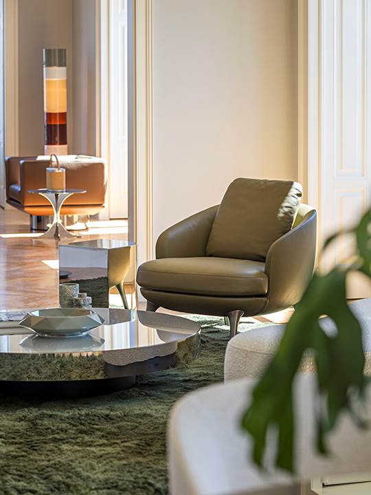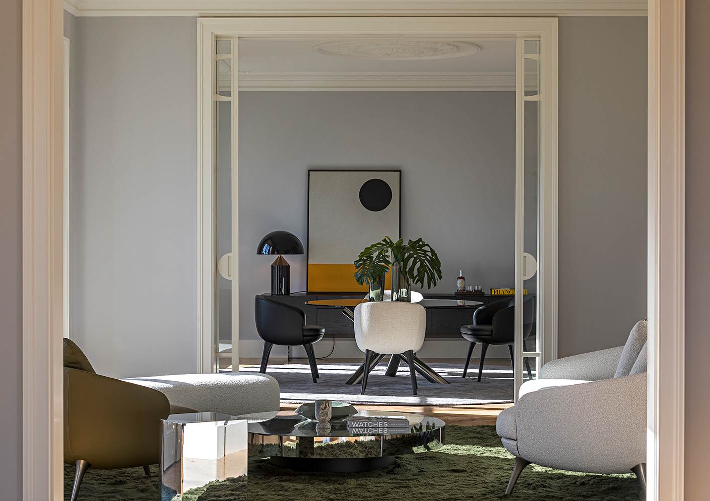 Vom Eingang aus gelangt man in einen ersten Wohnbereich, der mit den modernen, geschwungenen Linien der Sitzmöbelserie Raphael, Design GamFratesi, eingerichtet ist, die inmitten der eleganten klassischen Dekoration zusammen mit dem sanft gerundeten Volumen des Poufs Torii Bold von Nendo ihren idealen Platz finden. Auch im angrenzenden Essbereich spielen Rundungen eine Rolle. Hier steht der ikonische Tisch Van Dyck von Rodolfo Dordoni in seiner runden Version im Mittelpunkt, begleitet von den neuen Dining-Sesseln Raphael.