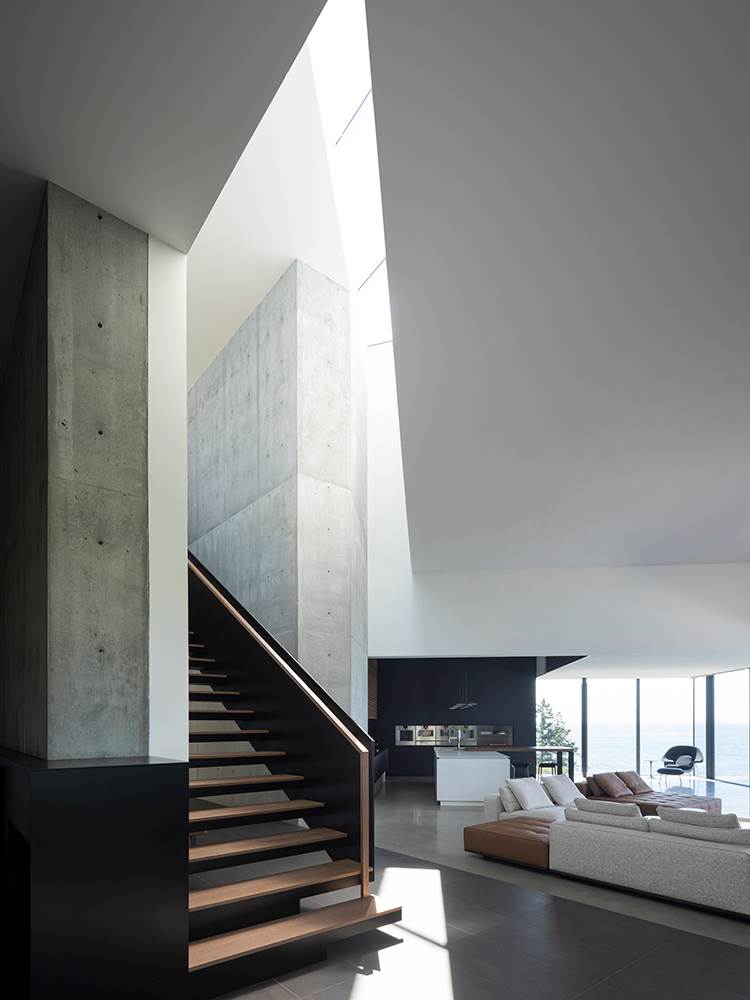Die Villa entwickelt sich über zwei Ebenen mit einer Gesamtfläche von etwa 900 Quadratmetern. Das von McLeod Bovell aus Vancouver entworfene Projekt beeindruckt durch seine besondere Geometrie, die am Schnittpunkt der versetzten Ebenen eine Art Hohlraum im Mittelpunkt des Gebäudes schafft.