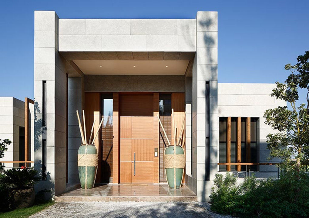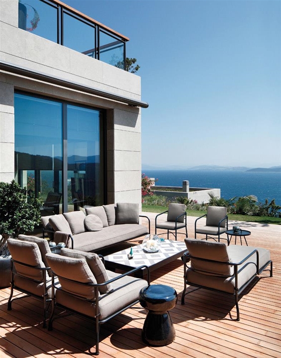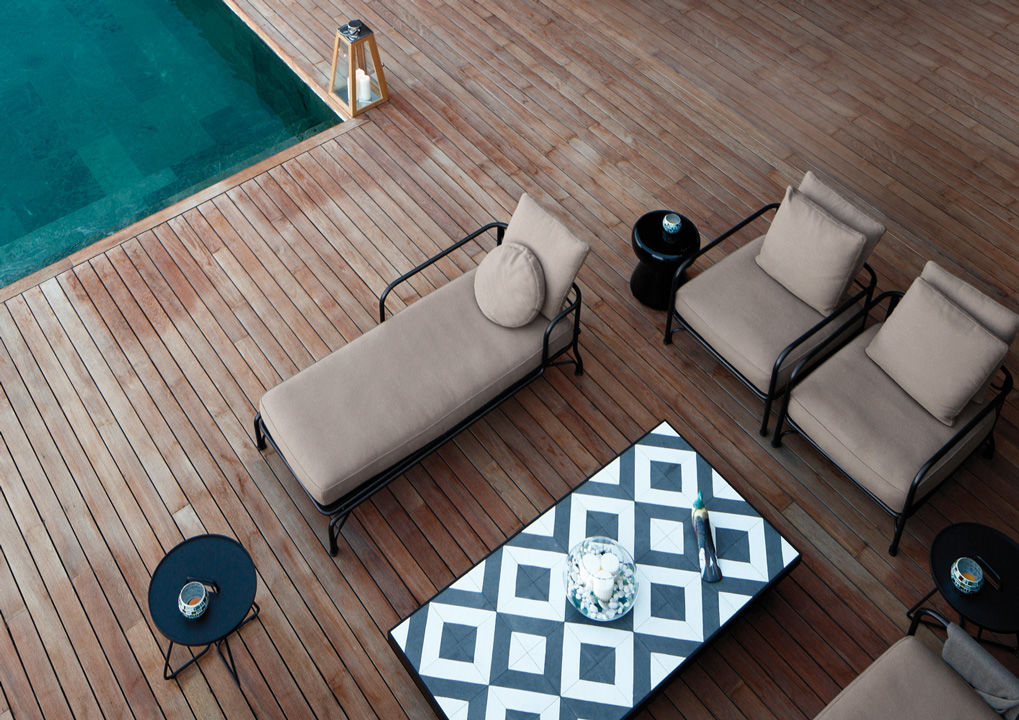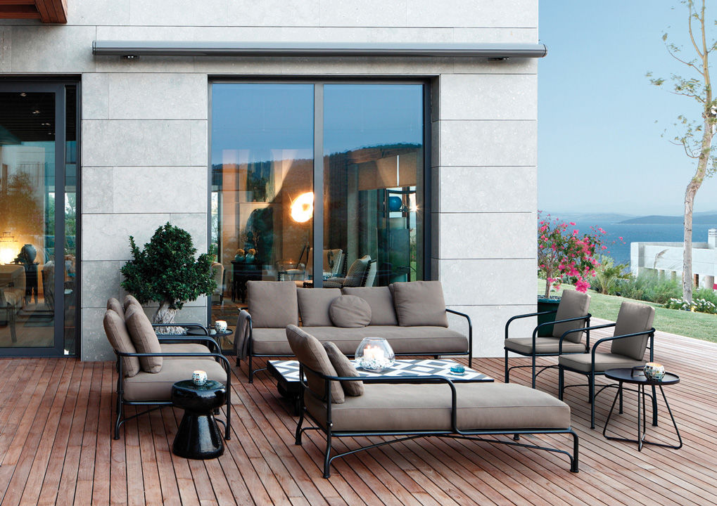 Für den Außenbereich am Swinging Pool wurden zahlreiche Elemente der Familie Le Parc gewählt: Sofa, Chaiselongue, Sessel und Stühle, mit schwarz-silberner Metallstruktur mit dem typischen Hammerschlageffekt und mit dem Stoff Fuji Tufo bezogenen Kissen.
