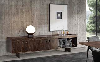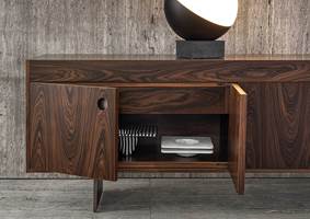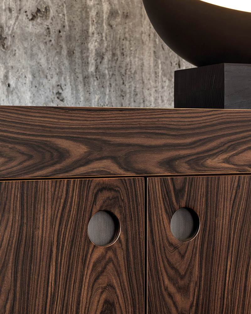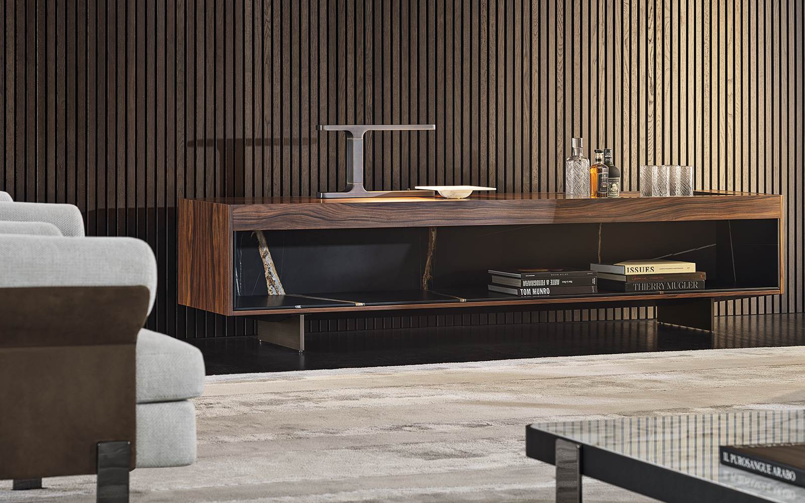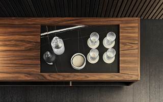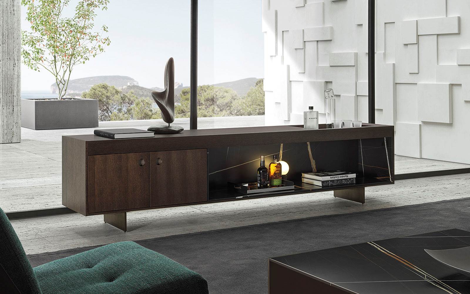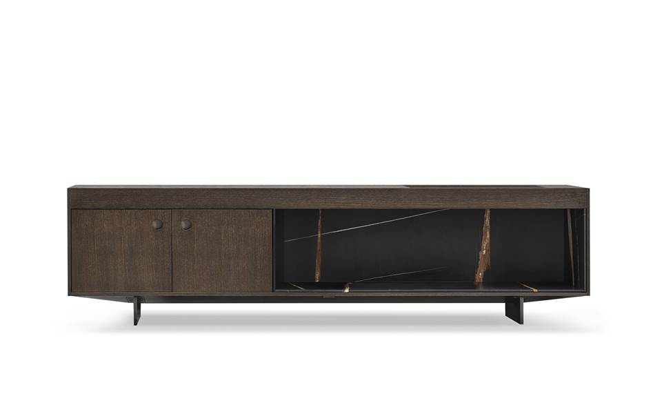 Die Living- und Dining-Behälter, mit einem einzigen offenen Fach oder kombiniert mit geschlossenen Türen, haben eine Struktur aus Eichenholz tabakfarbig getönt oder Santos-Palisander matt Polyester lackiert, auf dessen Oberseite auf einer Vertiefung die Abdeckplatte aus Marmor Sahara Noir ruht.