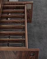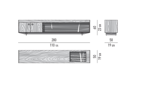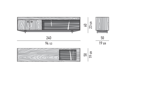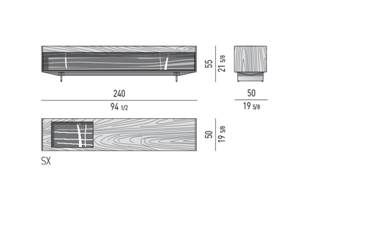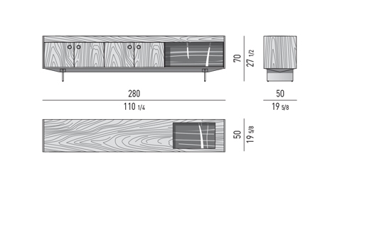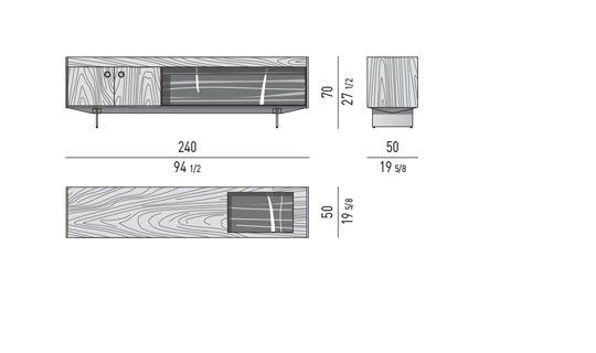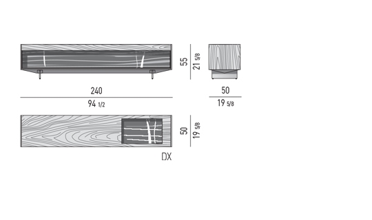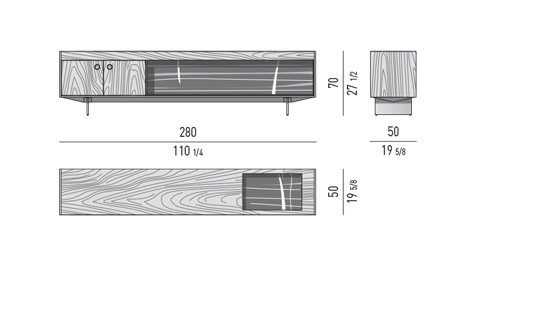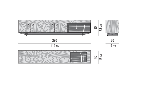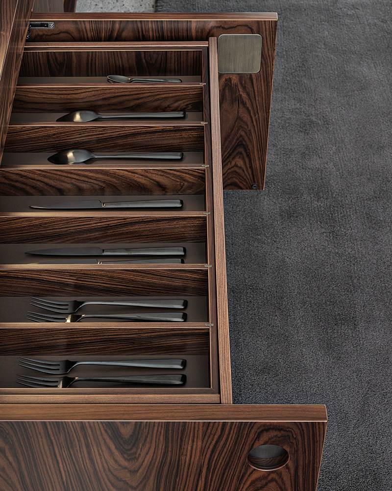 Schublade mit besteckkasten aus MDF, furniert mit Santos-Palisander*, matte Polyesterlackierung oder furniert mit Eiche mit offenporiger Lackierung in der Farbe Tabak, passend zur Strukturausführung. Kastenboden mit Beschichtung aus schwarzem Kernleder. Oben am Besteckkasten befinden sich Dekorelemente aus Metall mit Lackierung in der Farbe Golden Brown. Die Schublade mit besteckkasten gehört zur Ausstattung der Schränke 240x50 H70 cm und 280x50 H70 cm mit 2 und 4 Türen. * Santos Palisander stammt aus korrekt bewirtschafteten Wäldern.