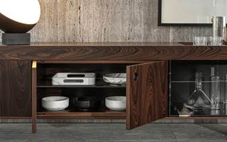 In der Dining-Version, sowohl mit zwei als auch vier Türen, ist die Innenverkleidung der Behälter in gleicher Ausführung wie die Außenseite und mit einer Besteckschublade und einer Regaleinlage aus Glas ausgestattet.