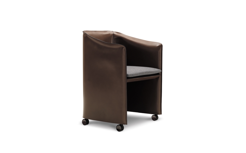 Ein kleiner Sessel, der seine natürliche Evolution im Case Roller findet, einem Stuhl mit beweglichen Rollen, die mit einem weichen Gummi bezogen sind, der vor Kratzspuren schützt.