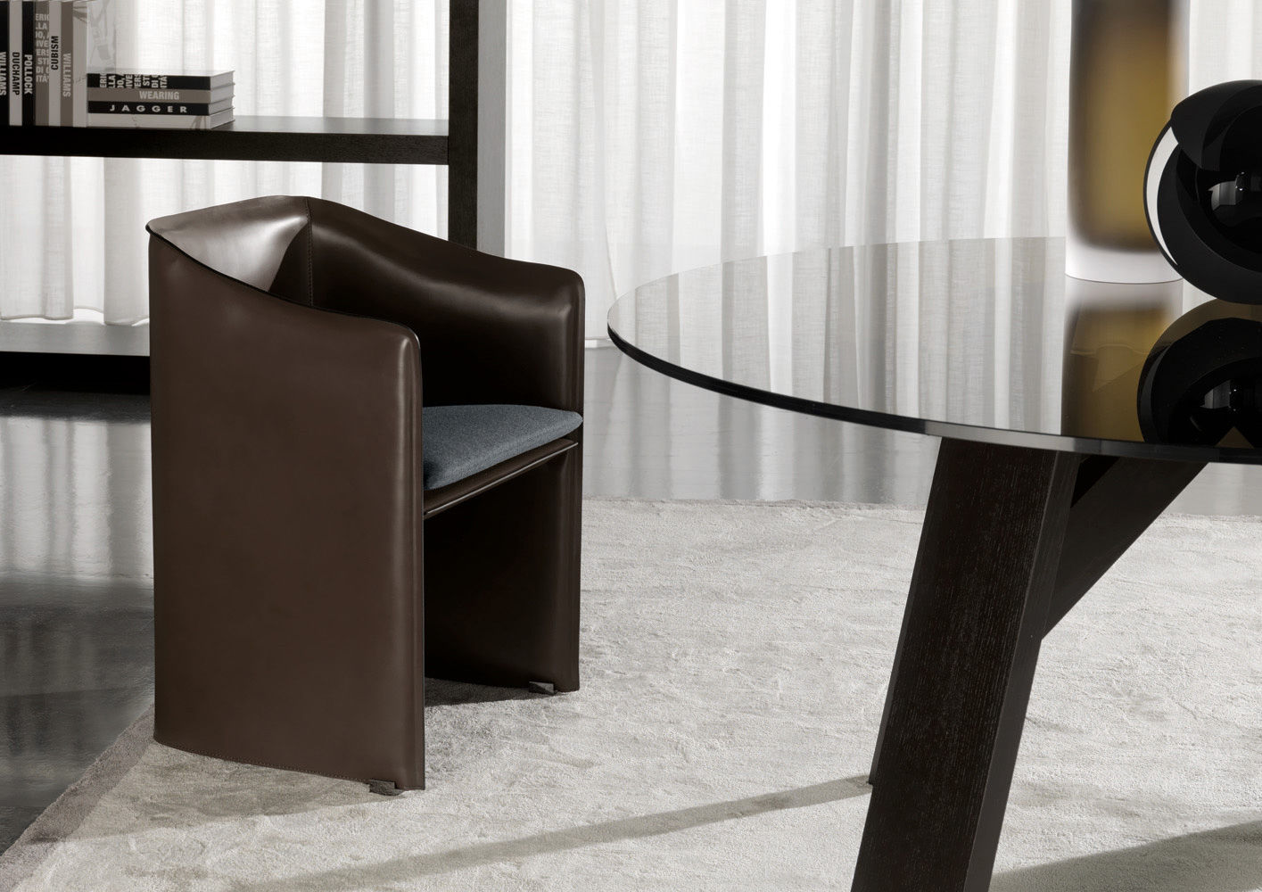 Ein Korb mit essentiellen Linien und gemäßigten Proportionen, dessen raffinierte Eleganz sich im Gebrauch eines edlen Materials wie dem Leder ausdrückt, passend zu allen Stoffen der exklusiven Textilkollektion von Minotti.