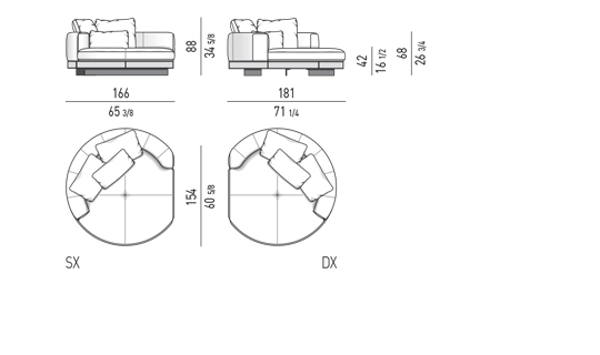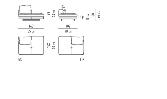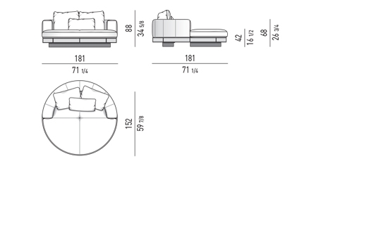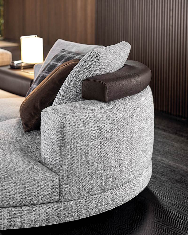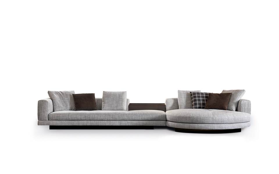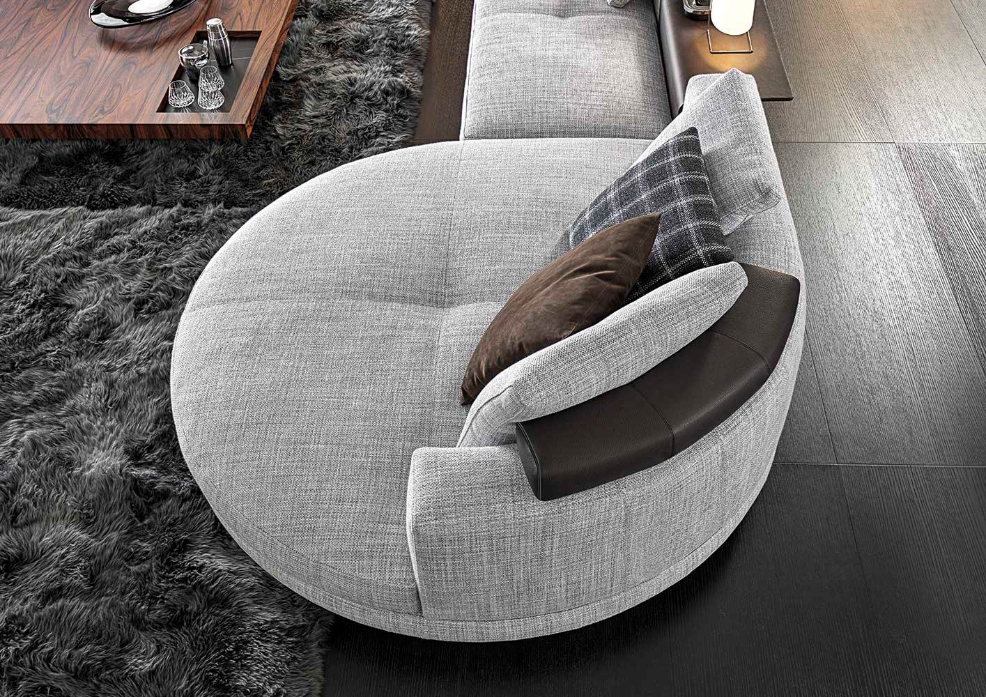 Das sehr breitgefächerte und in Hinsicht auf die Kompositionen personalisierbare Programm umfasst neben Chaise-Longues mit einer größeren Tiefe und quadratischer Form auch kreisförmige Elemente, die sich wie Atolle zum Sofa hinzufügen lassen.