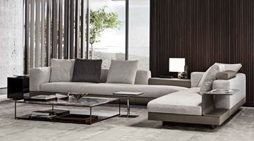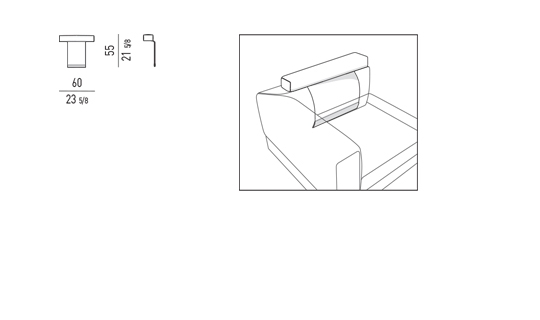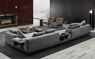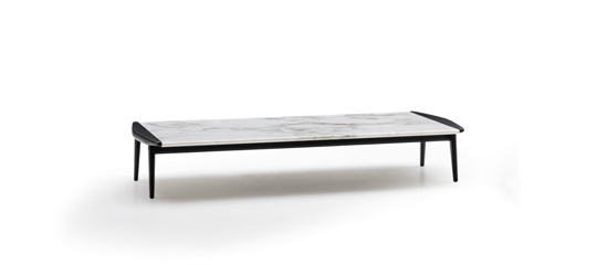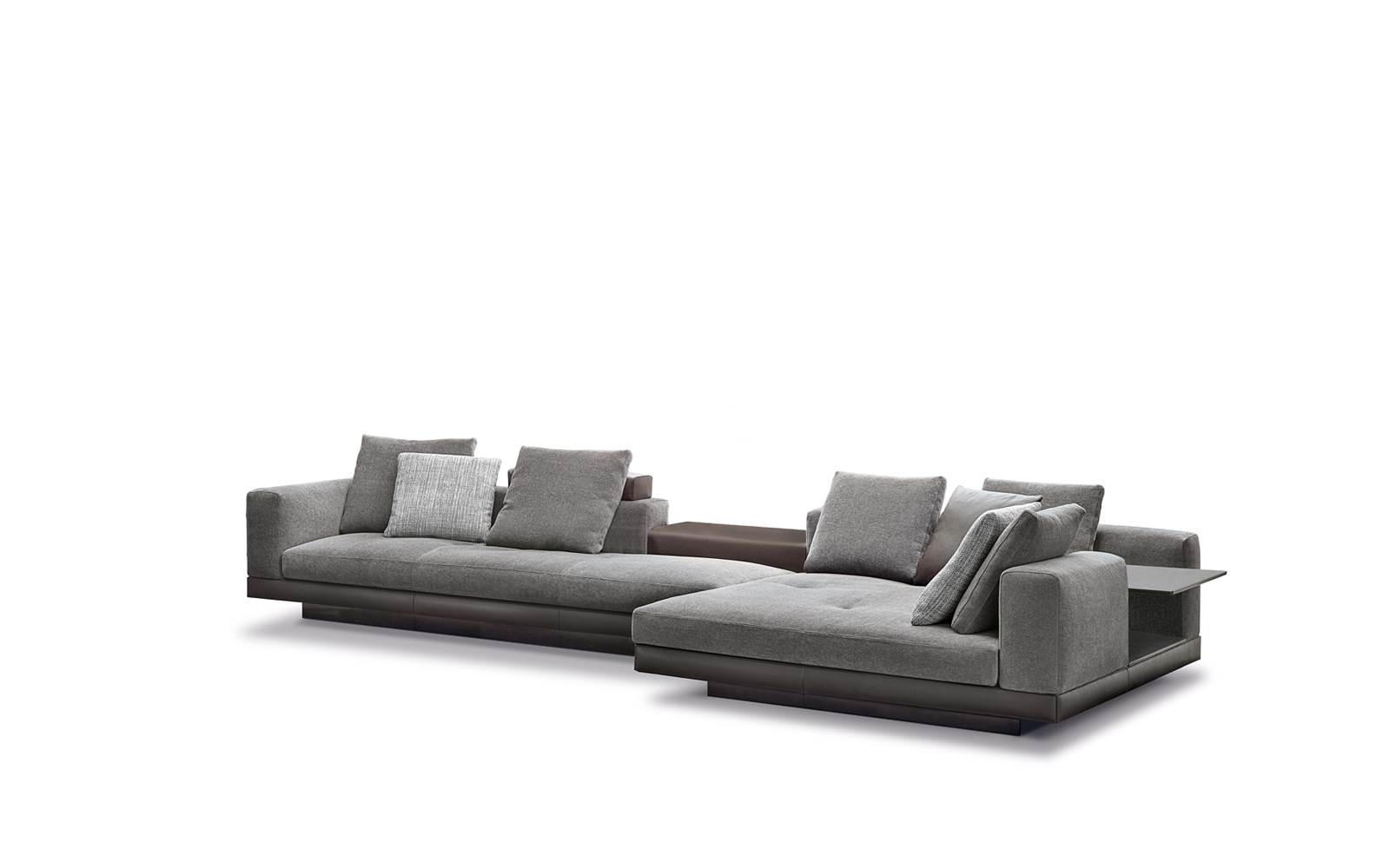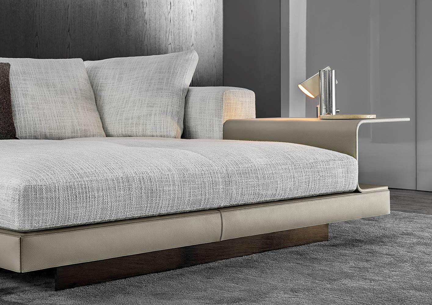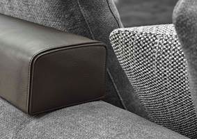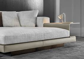 Der gepolsterte Unterbau des Sofas kann entweder mit einem Stoffbezug oder auch einem Bezug aus Lederstreifen verkleidet werden, die mit der aus der Herstellung hochwertiger Lederkoffer bekannten Technik verarbeitet werden. Das Konzept hochwertiger Lederwaren wird auch in den eleganten Kopfstützen und den edlen C-förmigen Ablageflächen Flap aufgegriffen, die harmonisch in die Sitzelemente integriert sind und den Kompositionen einen lebendigen Rhythmus verleihen.