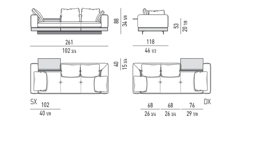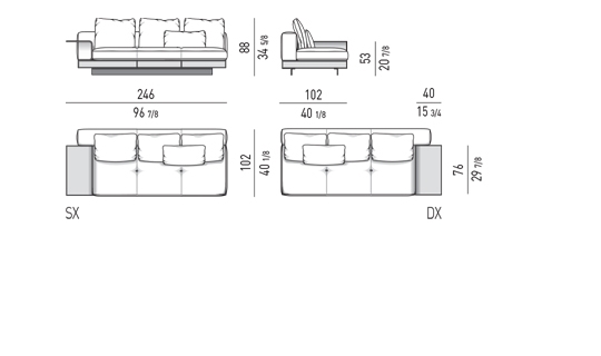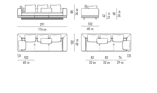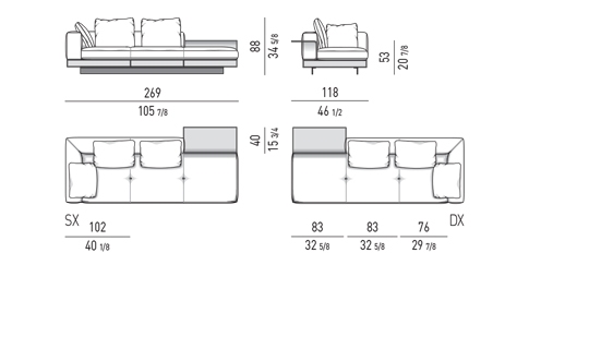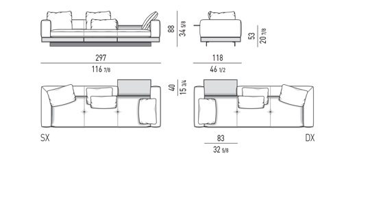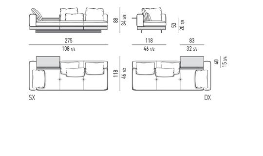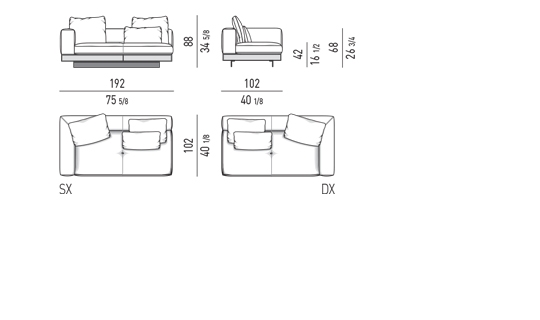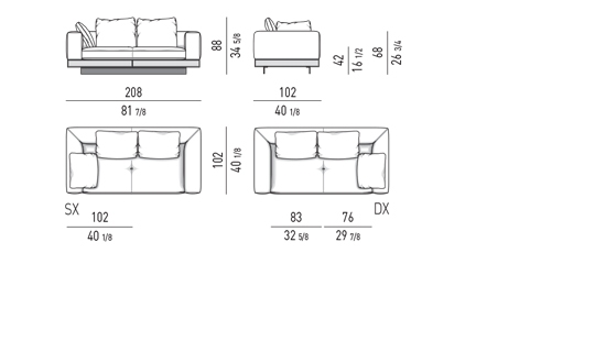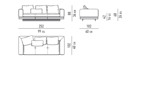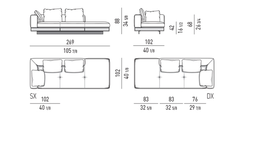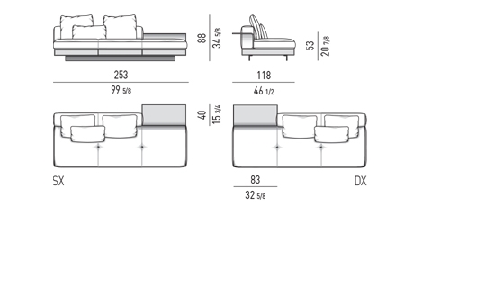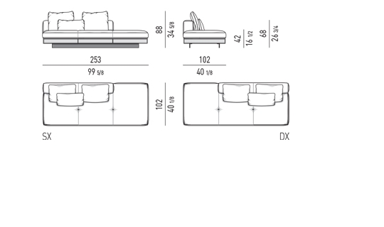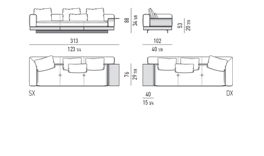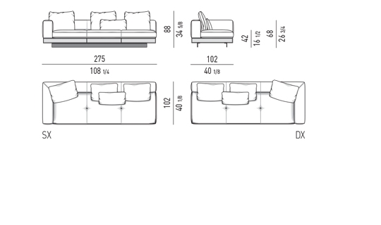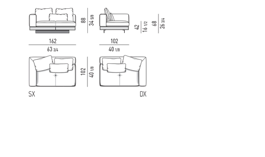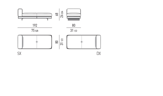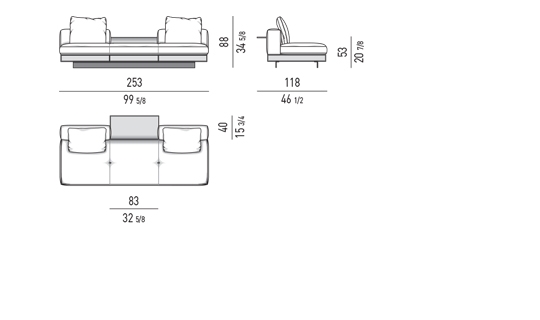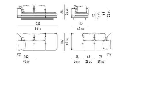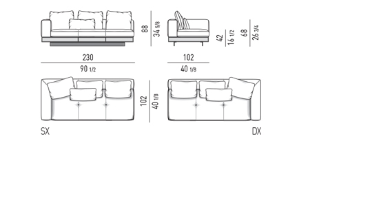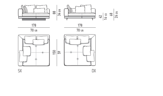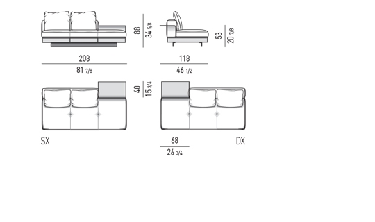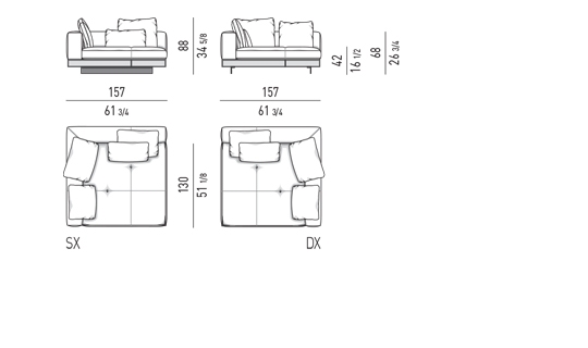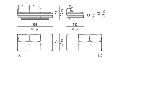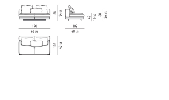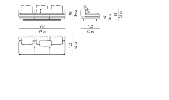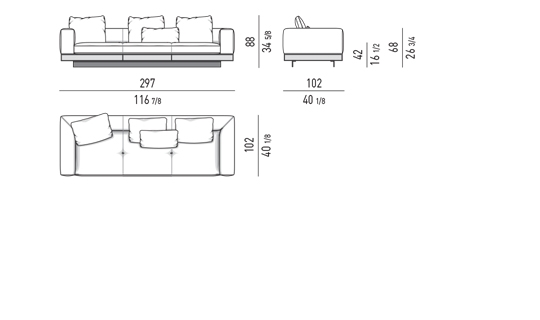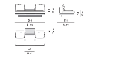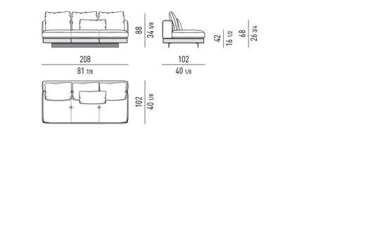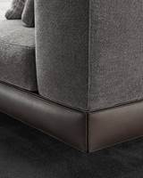 Der Sockel sorgt mit seiner geometrischen Strenge für einen originellen Kontrast zur Weichheit der Sitzfläche, einem durchgehenden Matratzenkissen, dessen zarte Steppnähte die Breite der einzelnen Sitzflächen (83 cm oder 68 cm) markieren, sowie zur Struktur der Rücken- und Armlehnen, die mit einer Daunenschicht verkleidet sind. Die Rückenlehne bildet eine Einheit mit der Armlehne, mit einem 45°-Spalt in der Ecke.