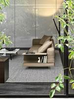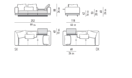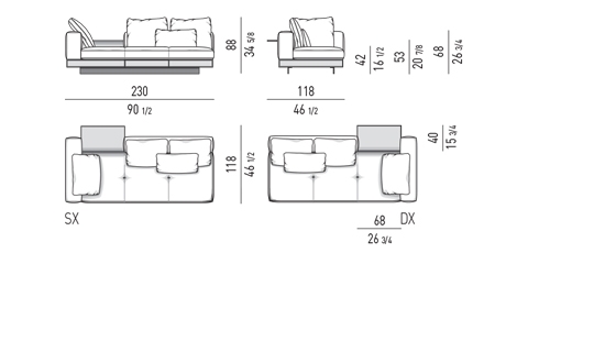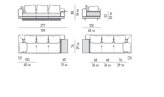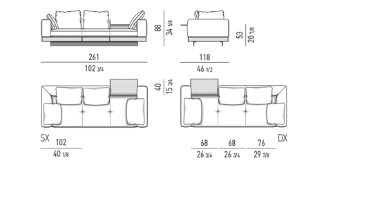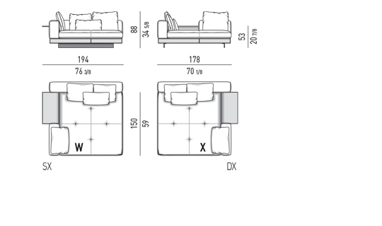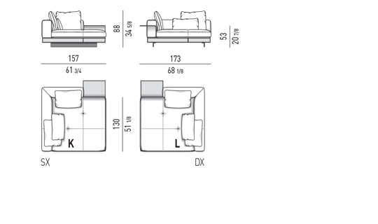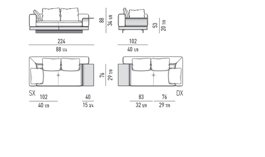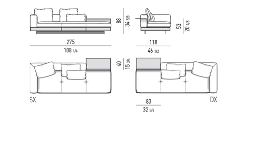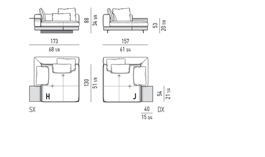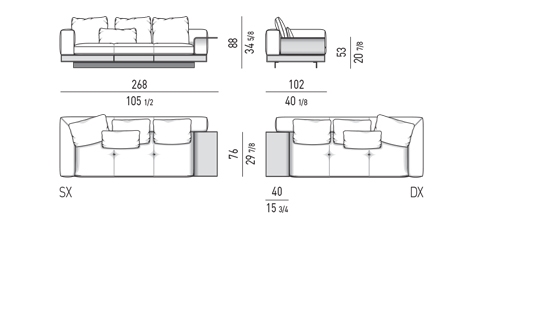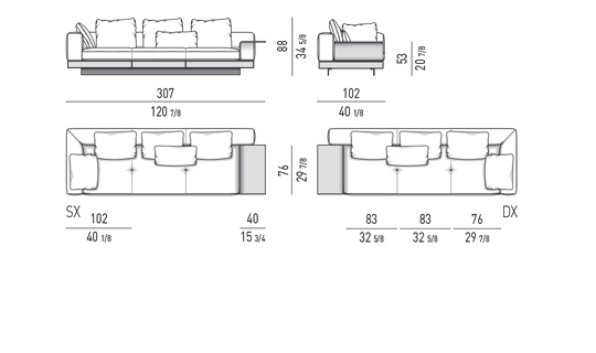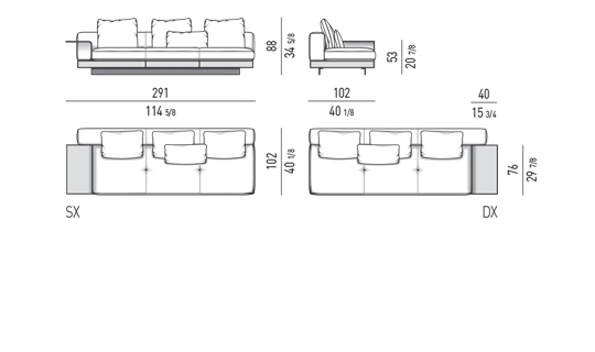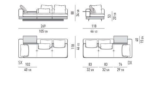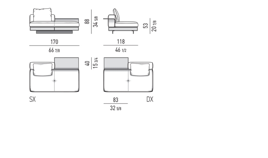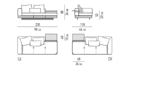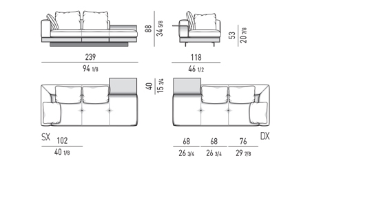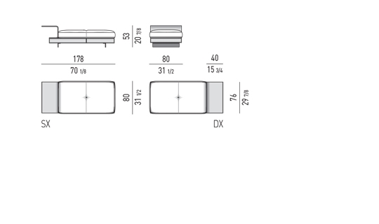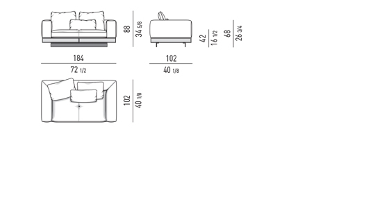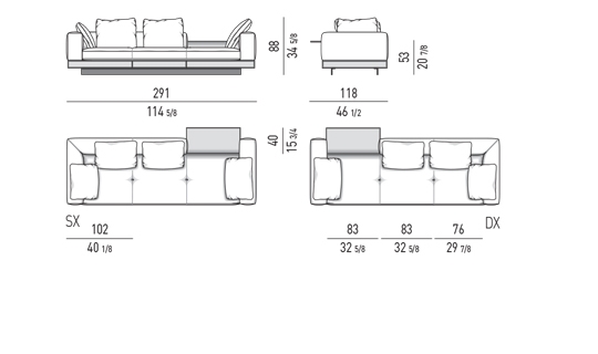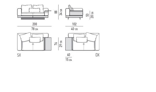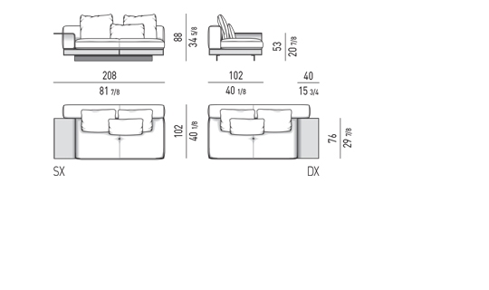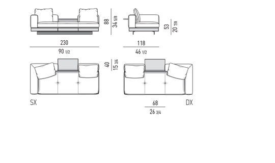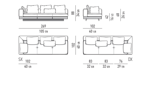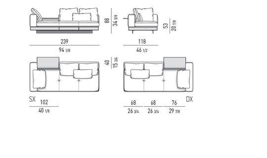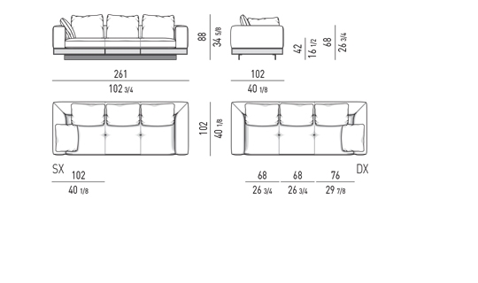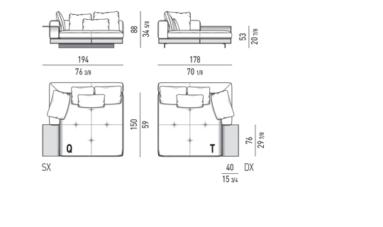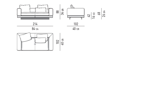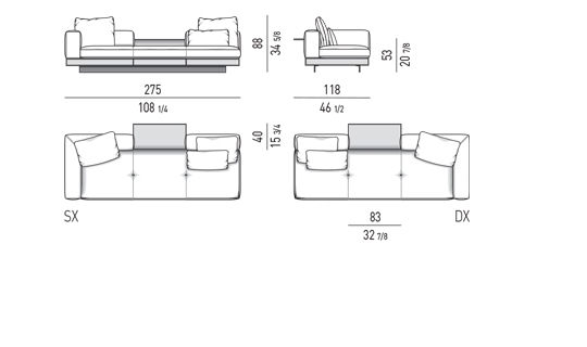 Der Sockel sorgt mit seiner geometrischen Strenge für einen originellen Kontrast zur Weichheit der Sitzfläche, einem durchgehenden Matratzenkissen, dessen zarte Steppnähte die Breite der einzelnen Sitzflächen (83 cm oder 68 cm) markieren, sowie zur Struktur der Rücken- und Armlehnen, die mit einer Daunenschicht verkleidet sind. Die Rückenlehne bildet eine Einheit mit der Armlehne, mit einem 45°-Spalt in der Ecke.